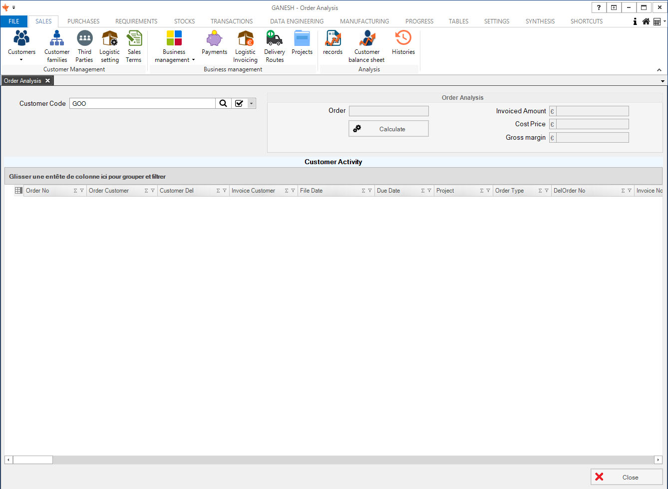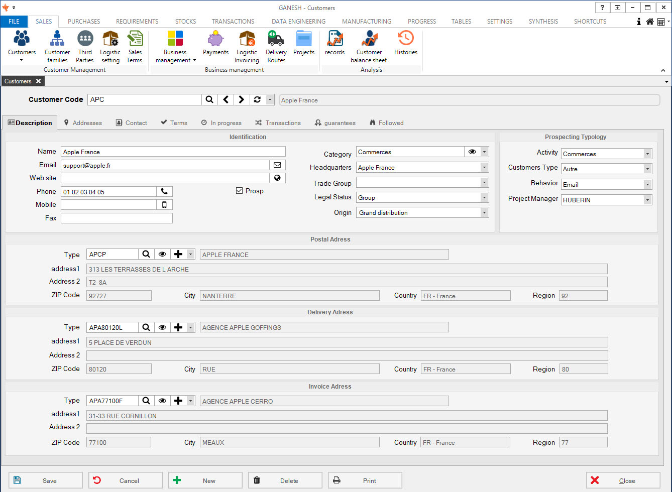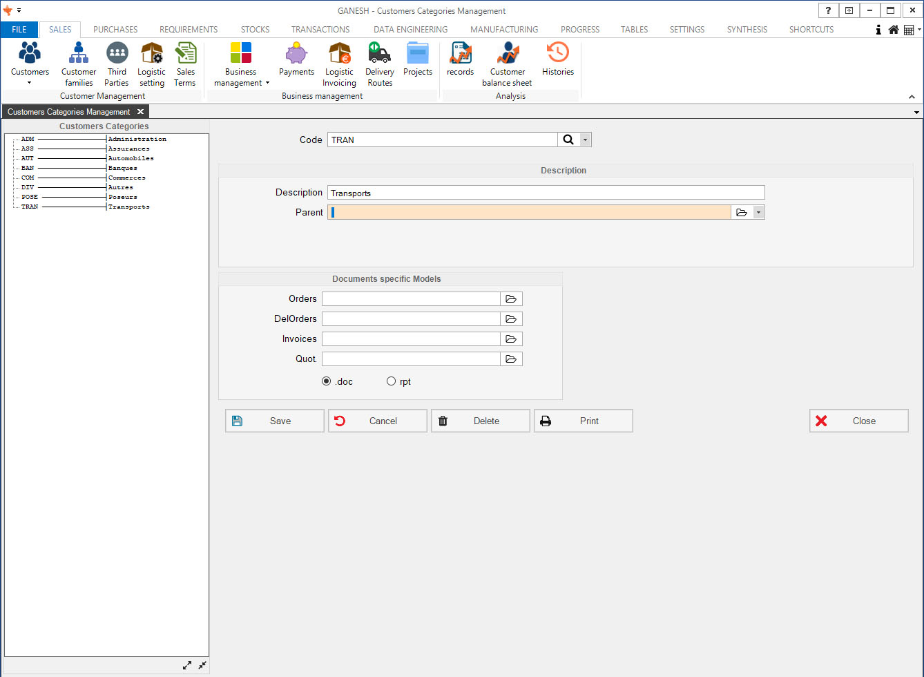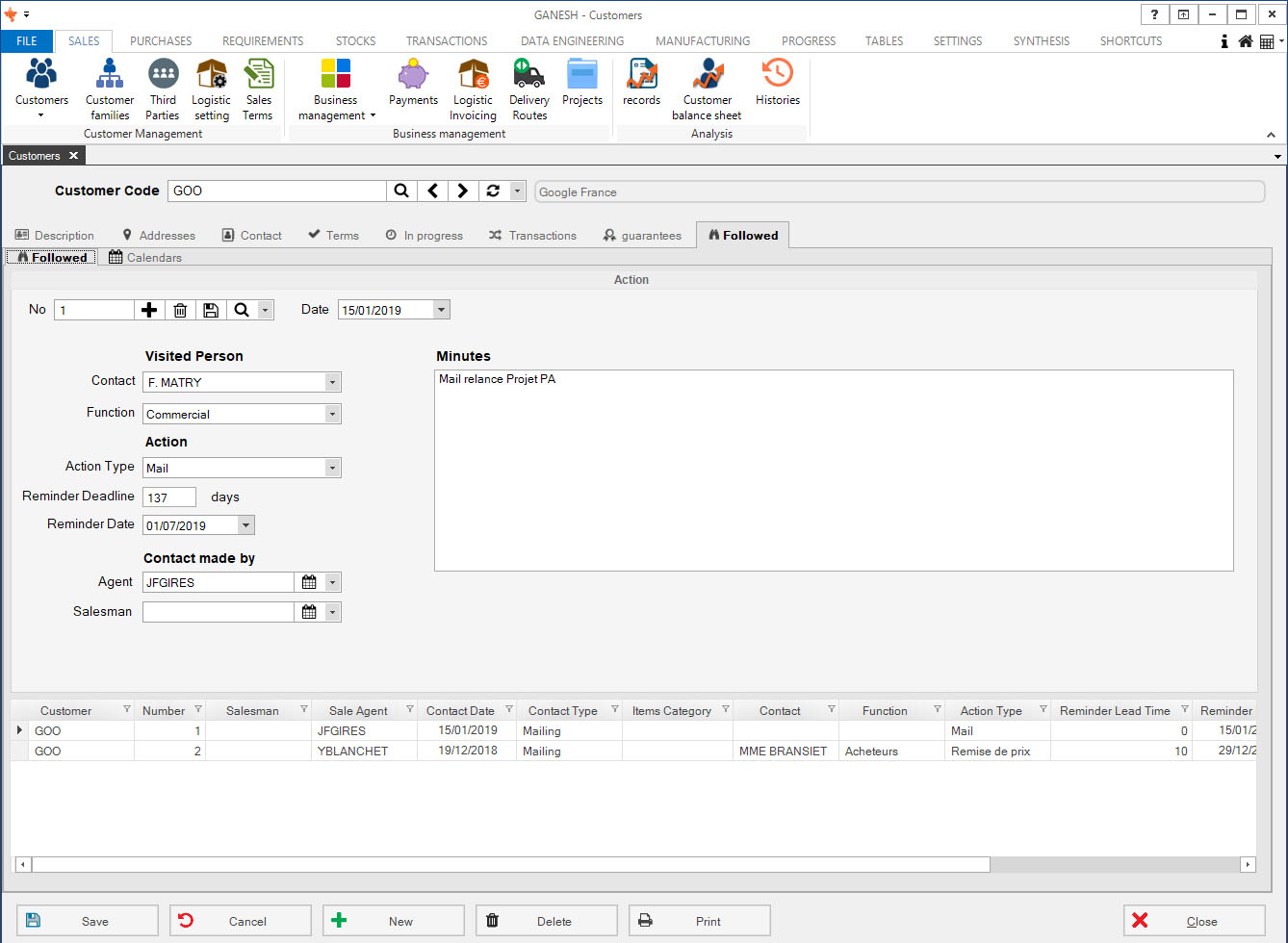 The "Sales" tab of Ganesh software includes all your sales and customers functions. In this intuitive menu divided into three parts are options for managing your customers, business and their follow-ups