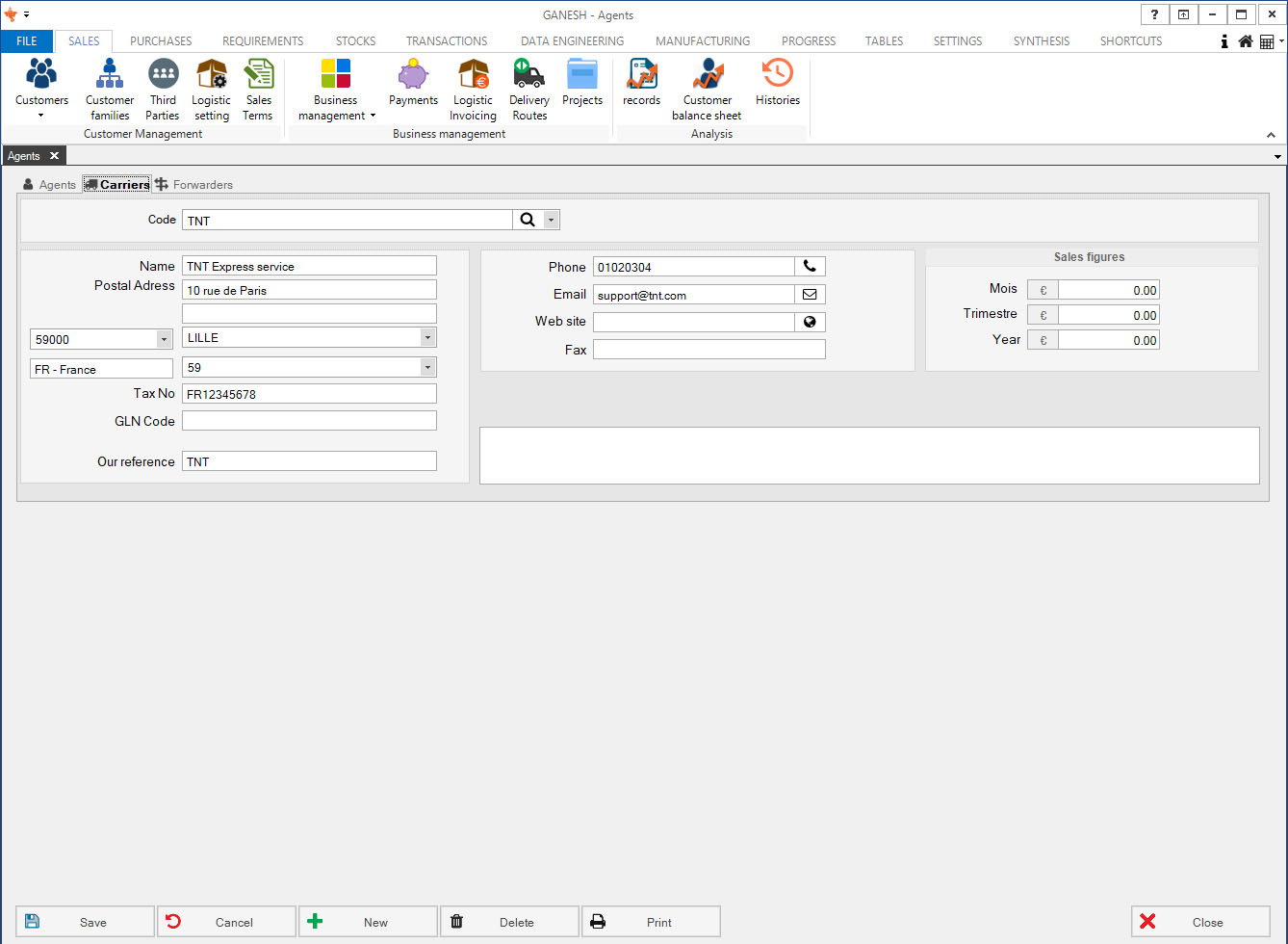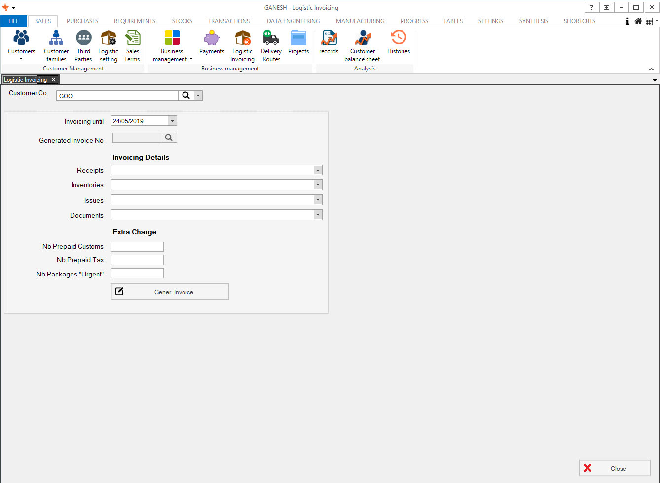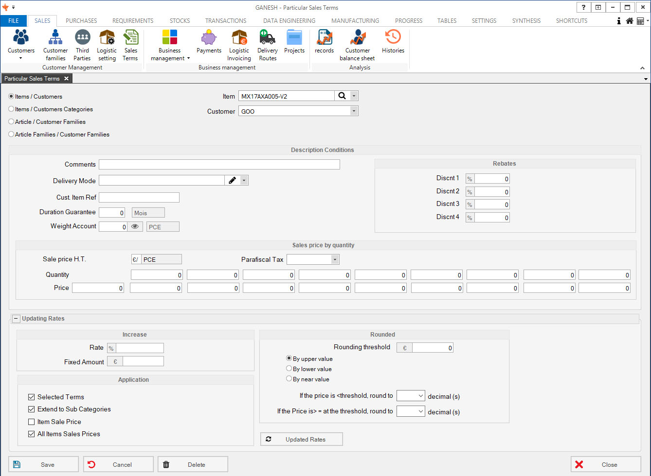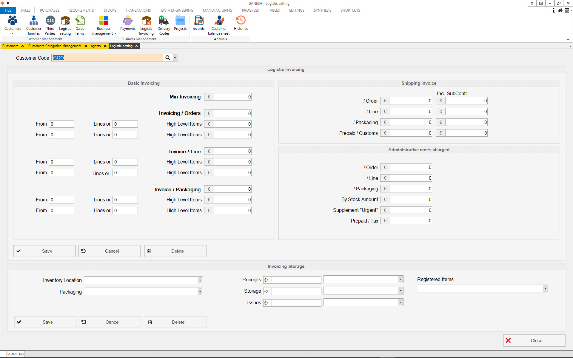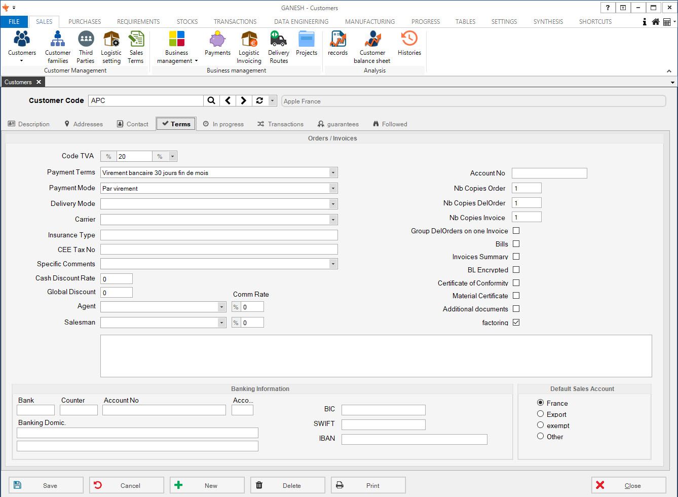 The "Sales" tab of Ganesh software includes all your sales and customers functions. In this intuitive menu divided into three parts are options for managing your customers, business and their follow-ups
