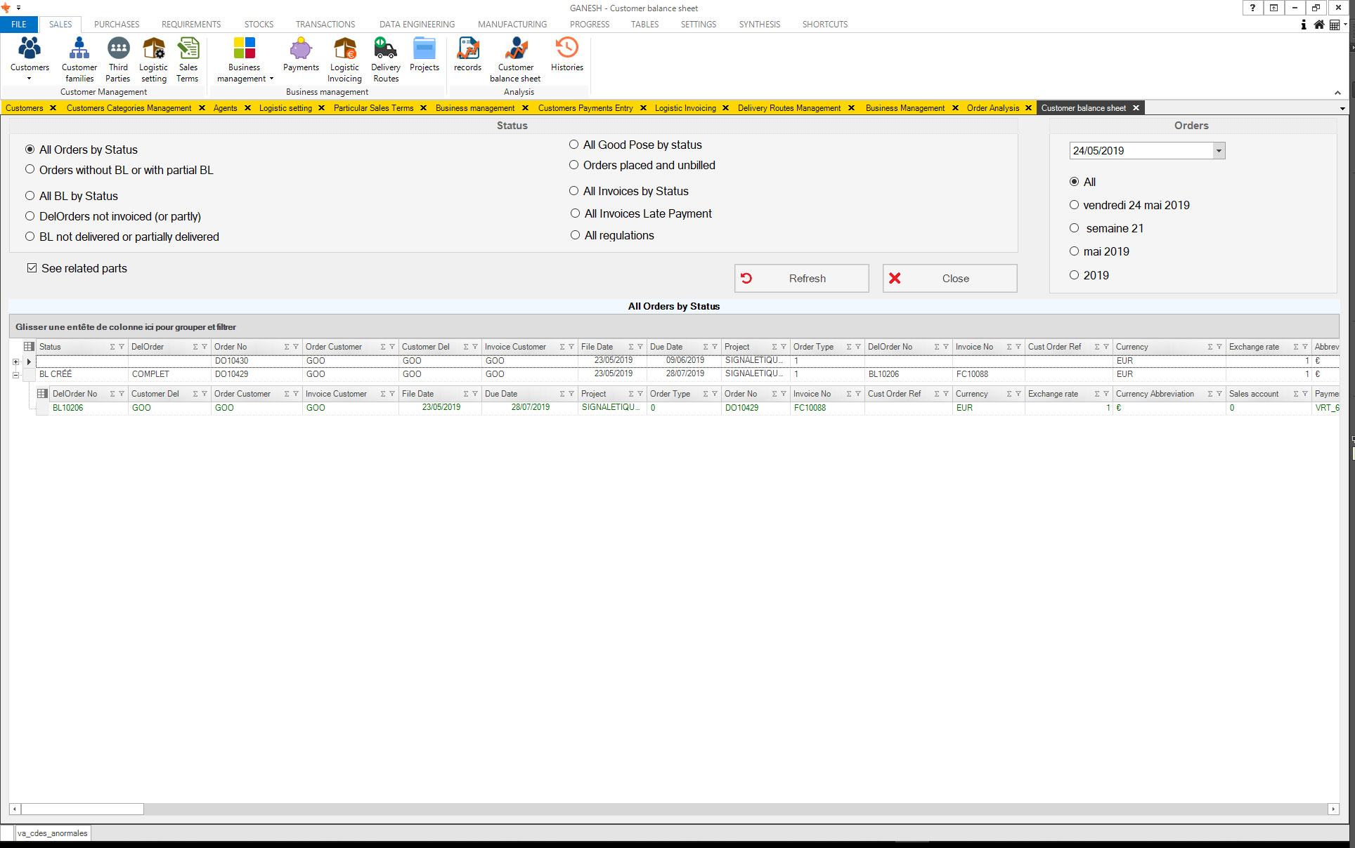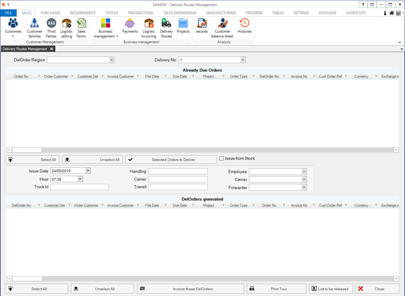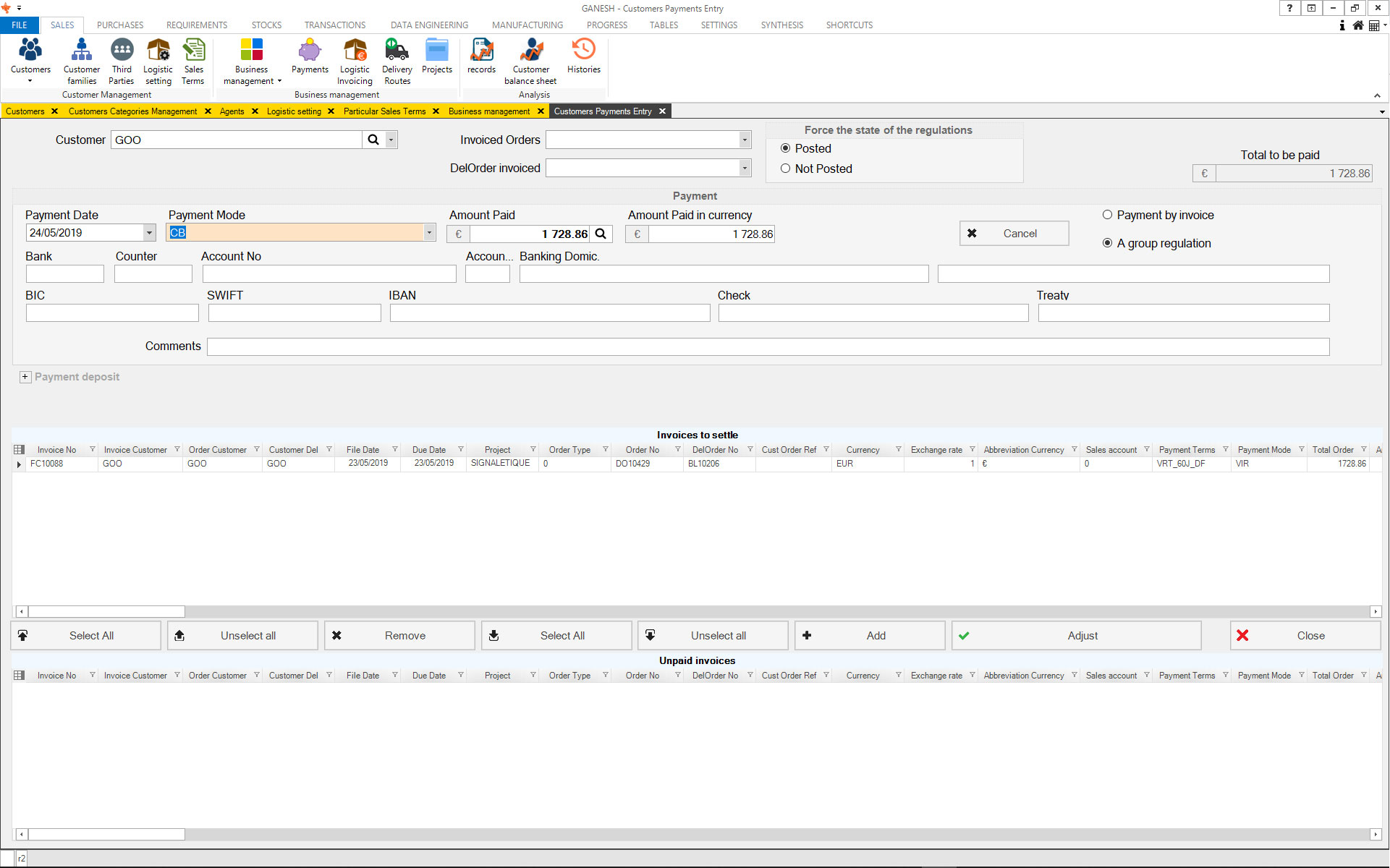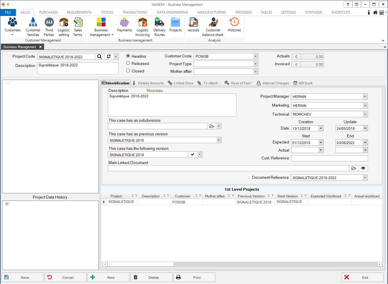 The "Sales" tab of Ganesh software includes all your sales and customers functions. In this intuitive menu divided into three parts are options for managing your customers, business and their follow-ups