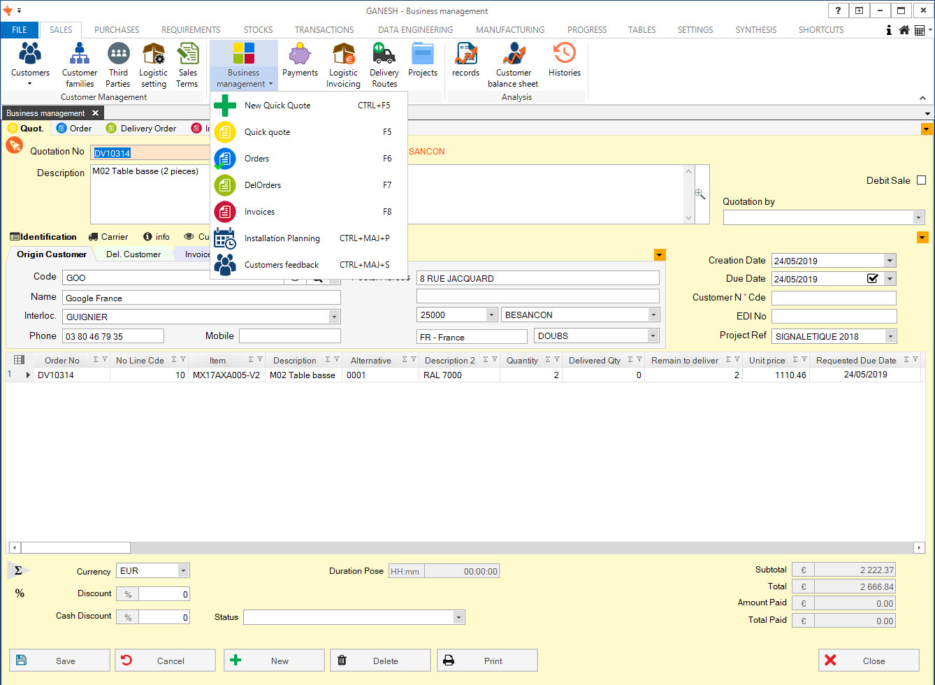 - Commercial management : Quotes, files, delivery notes, invoices, planning of installations