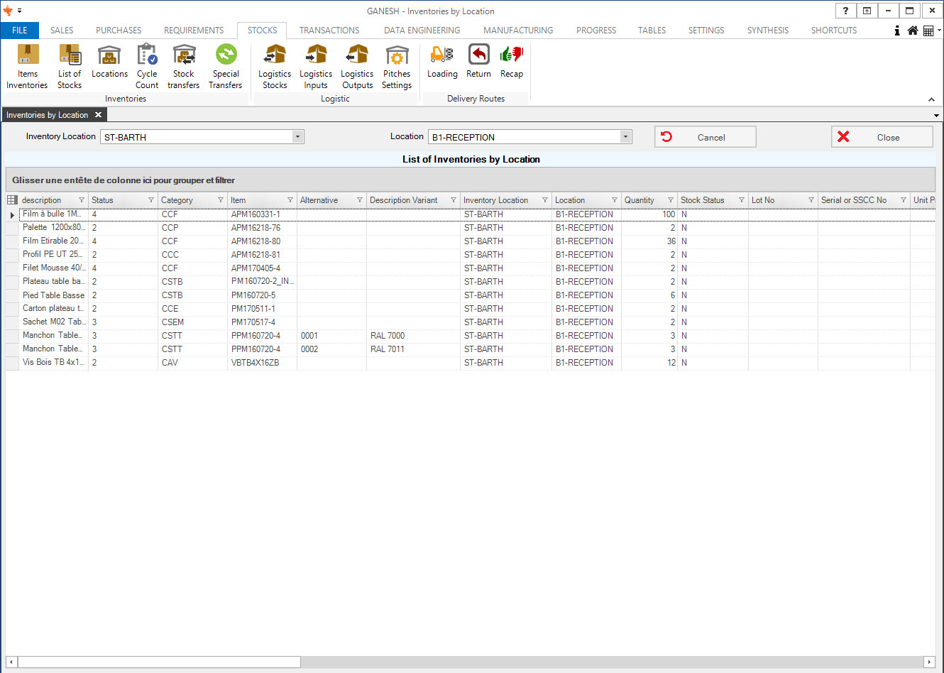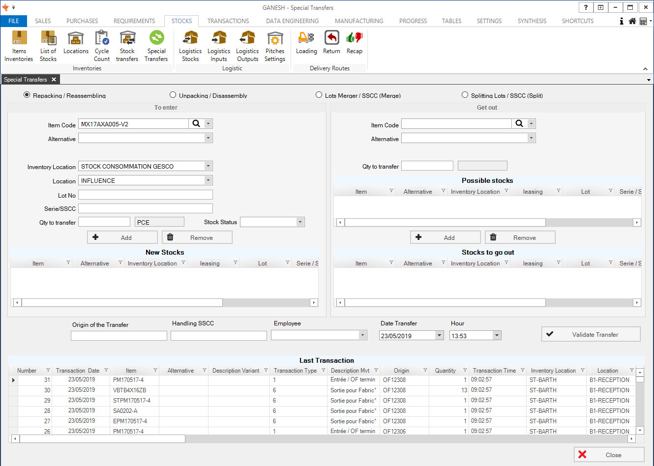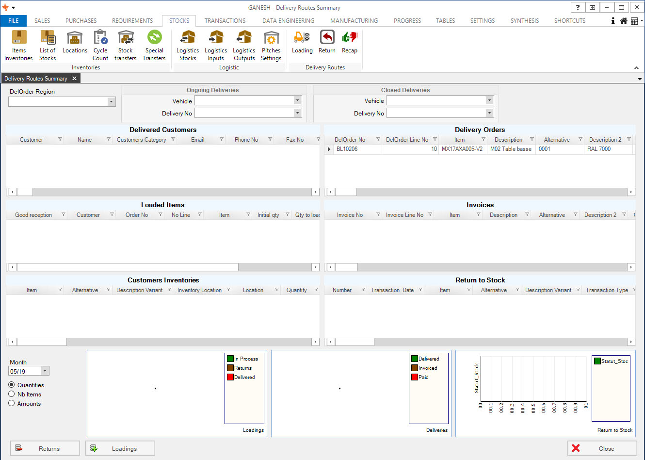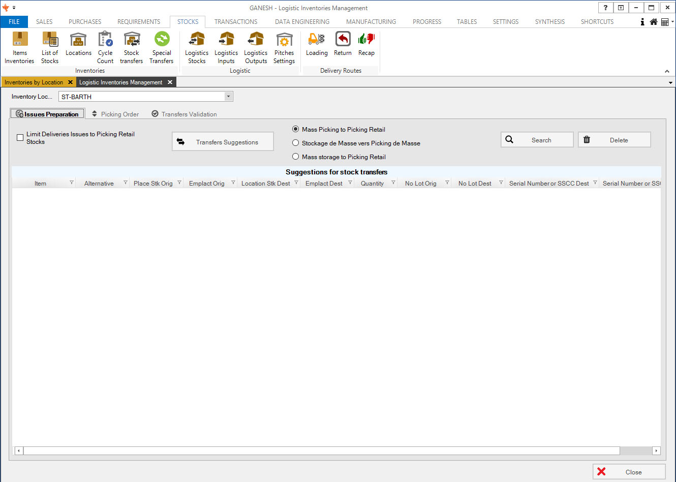 The Ganesh software "Stock" tab includes inventory management functions. The menu of the "Stock" tab is divided into three parts: Stock Management, Logistics and Touring Stocks.