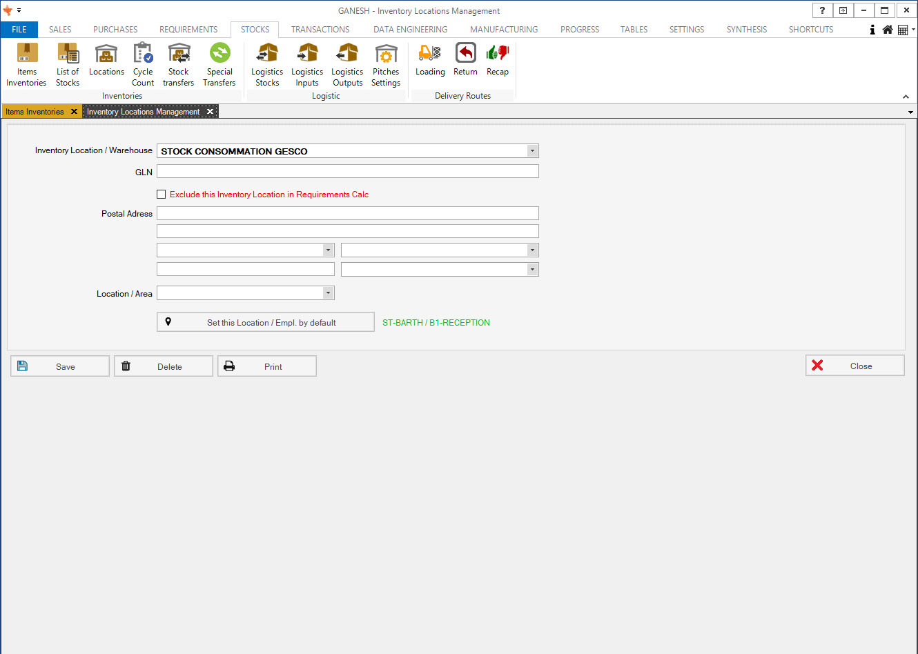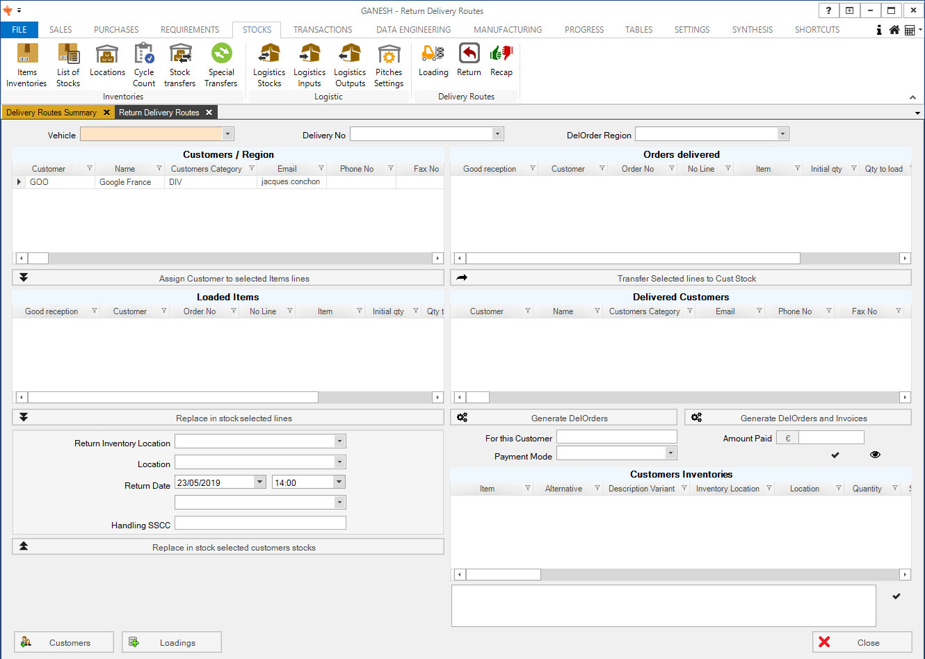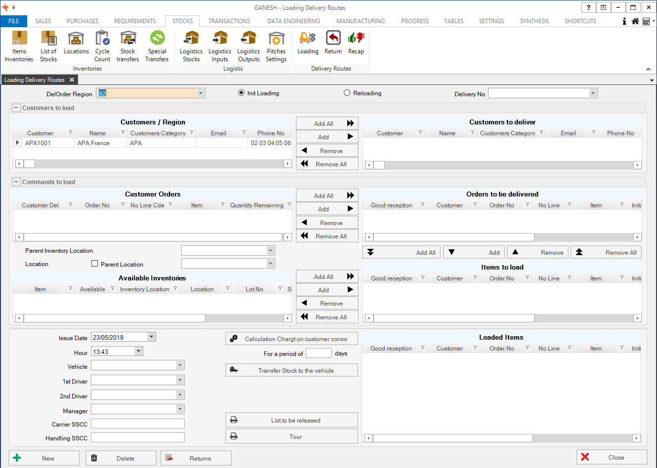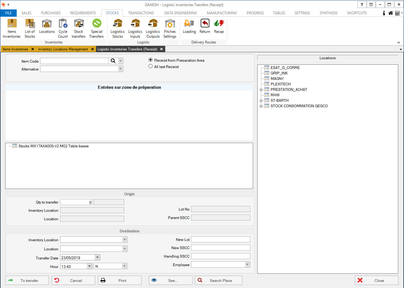 The Ganesh software "Stock" tab includes inventory management functions. The menu of the "Stock" tab is divided into three parts: Stock Management, Logistics and Touring Stocks.