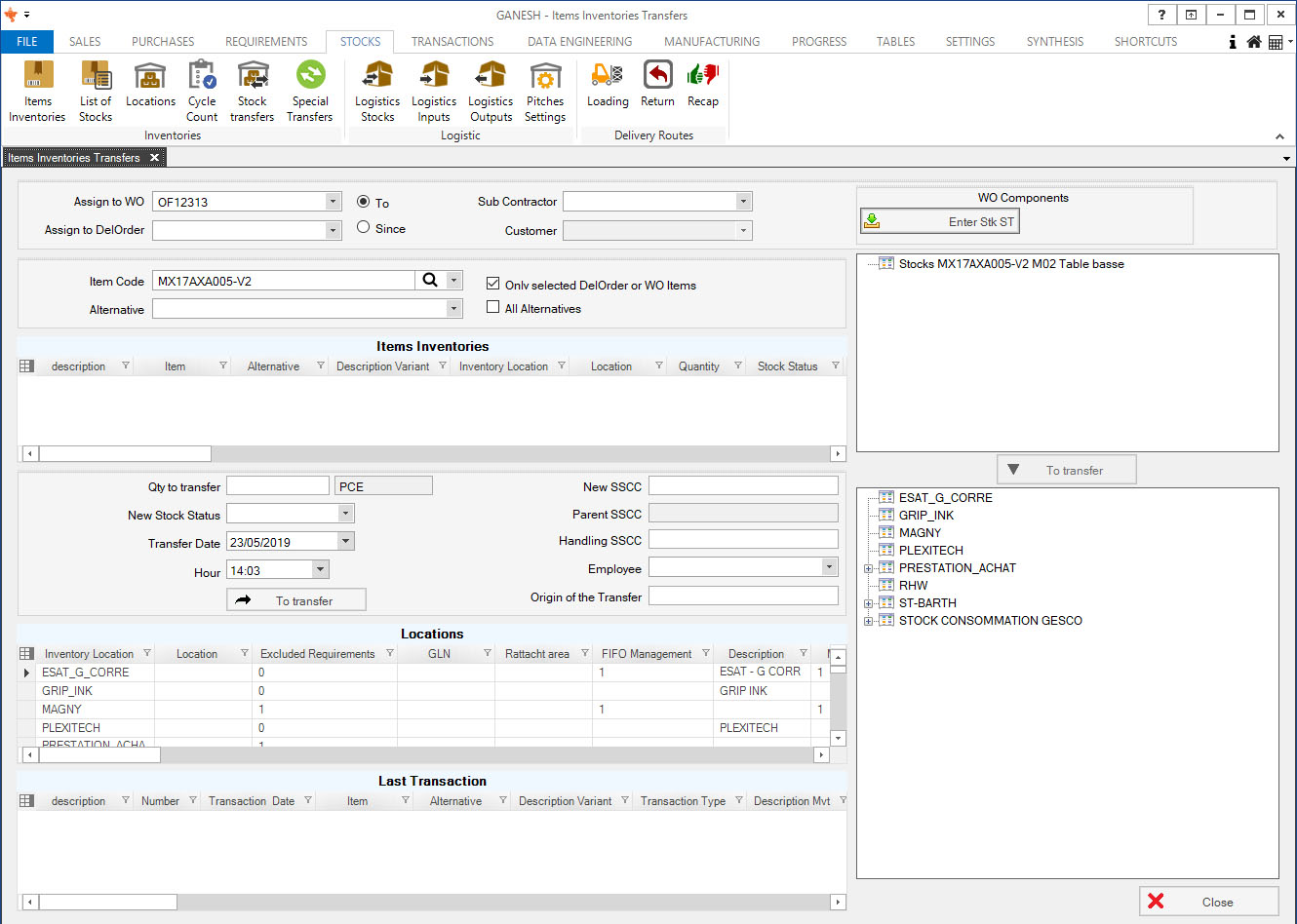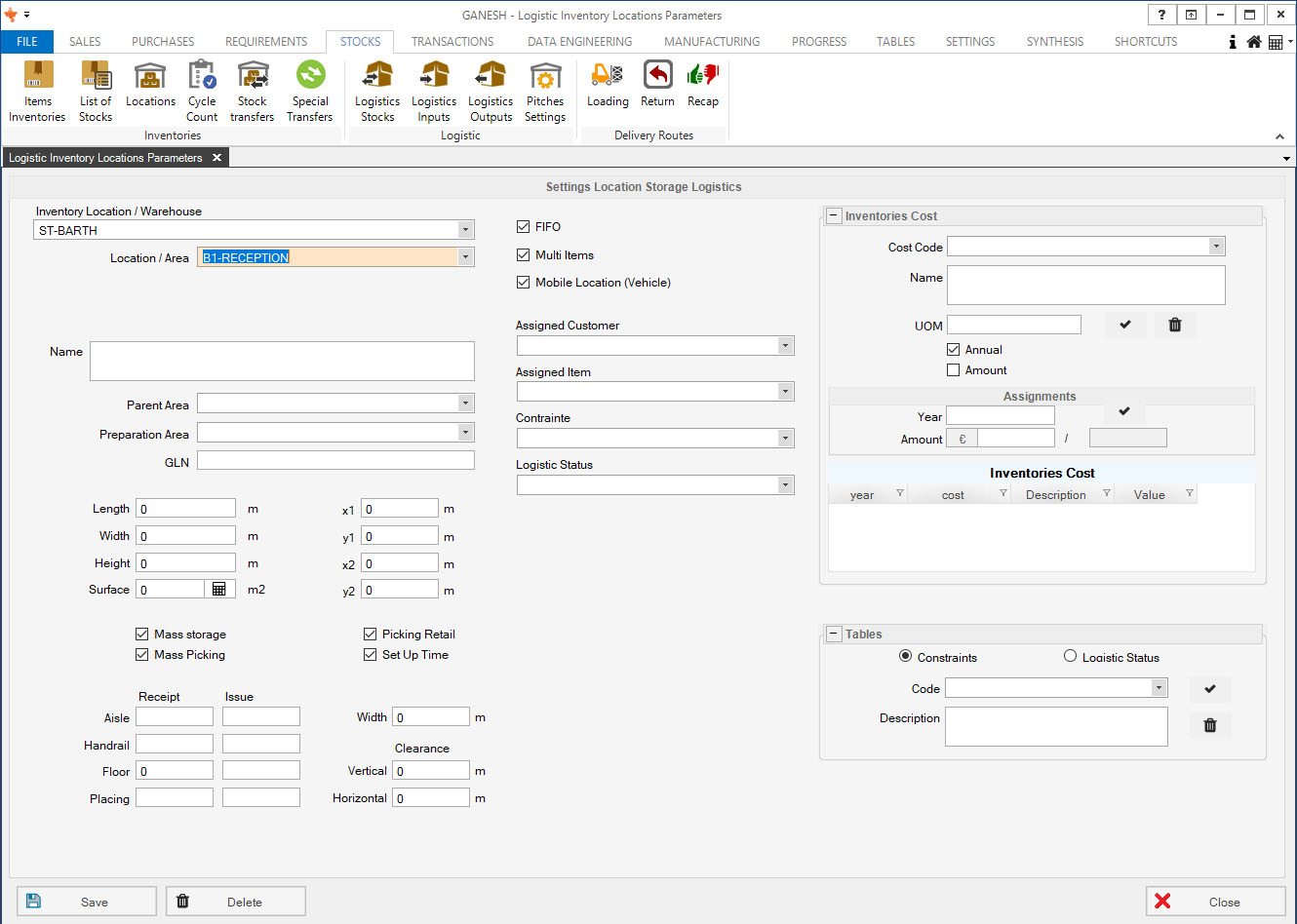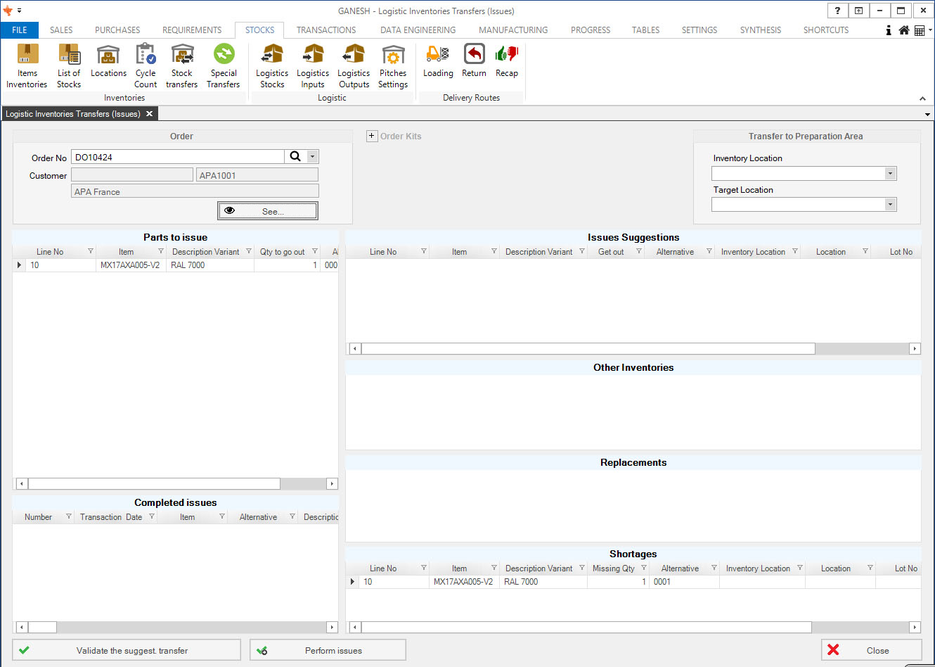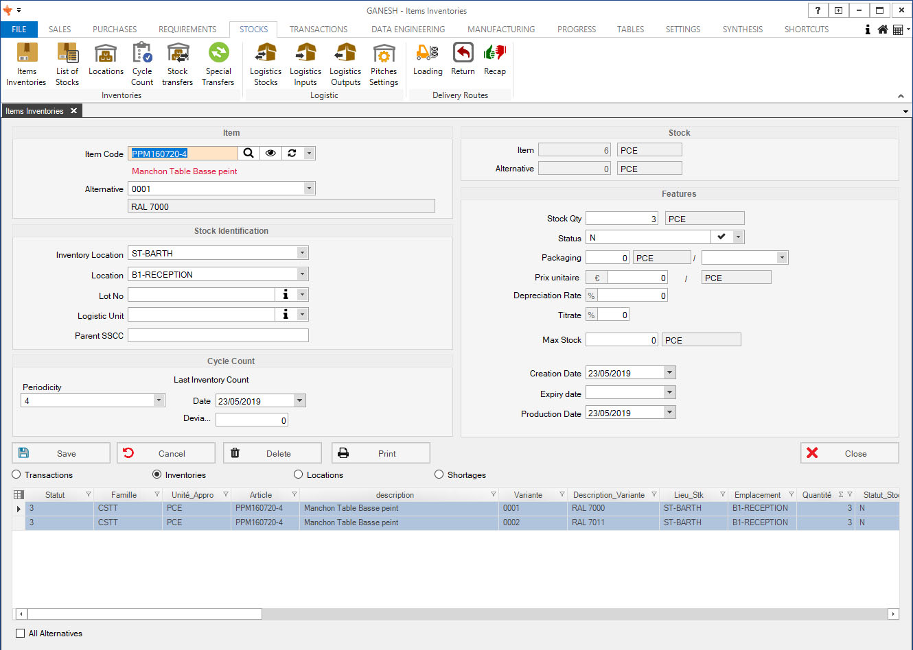 The Ganesh software "Stock" tab includes inventory management functions. The menu of the "Stock" tab is divided into three parts: Stock Management, Logistics and Touring Stocks.