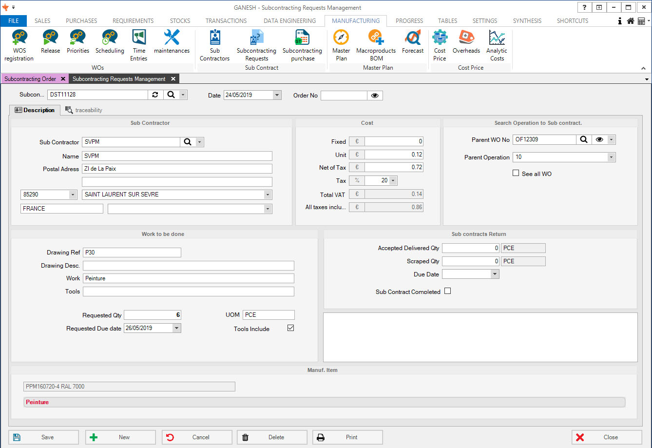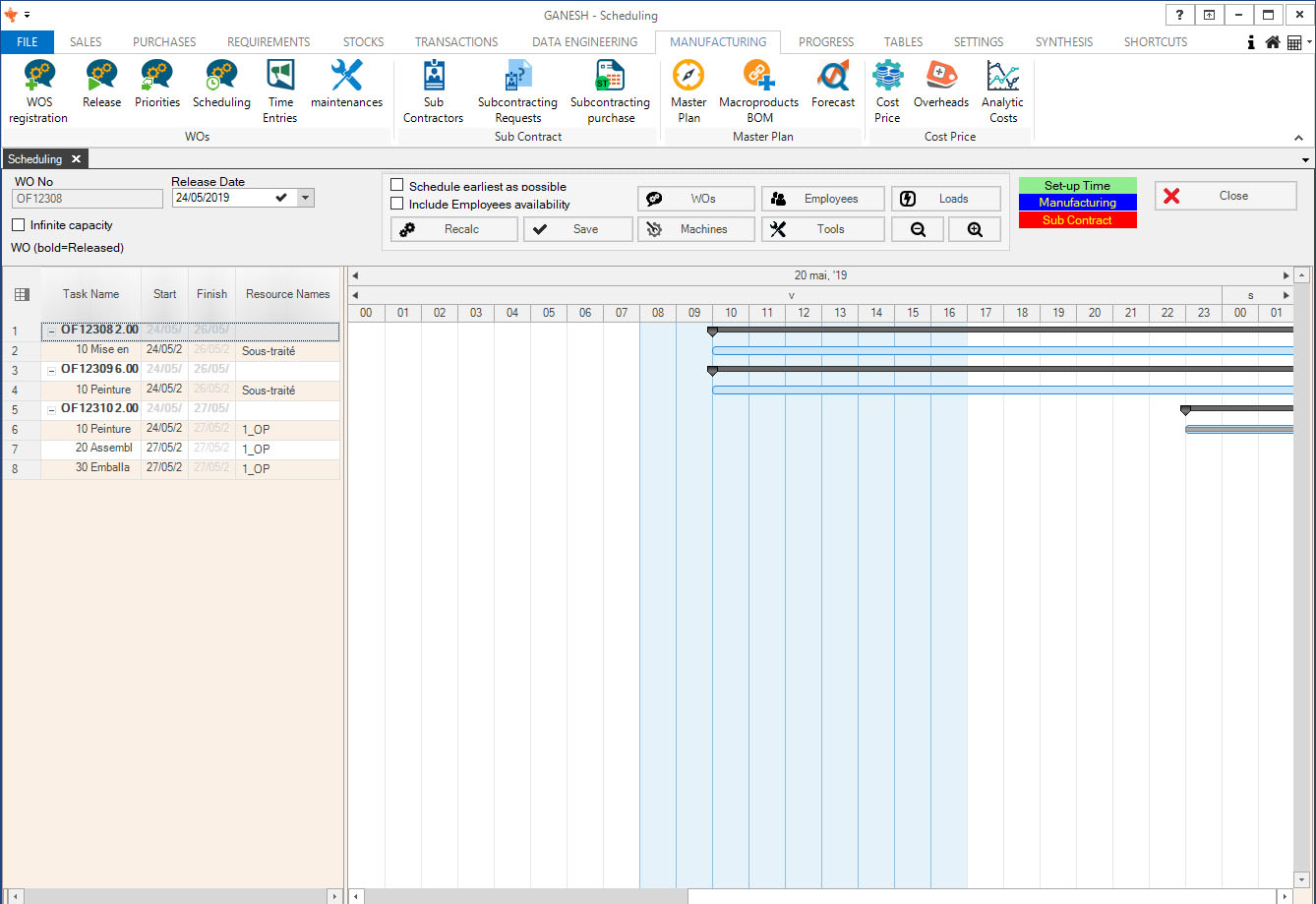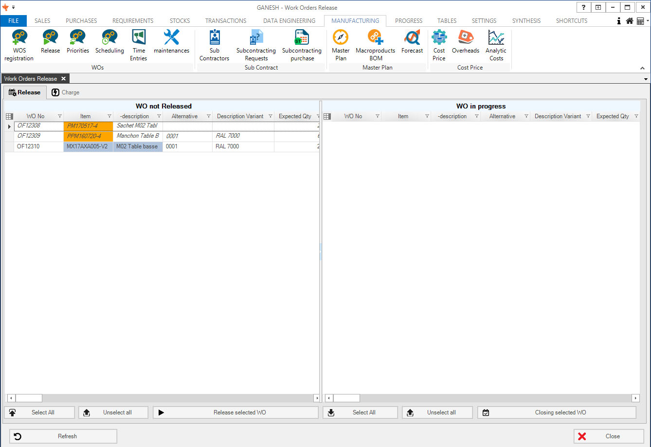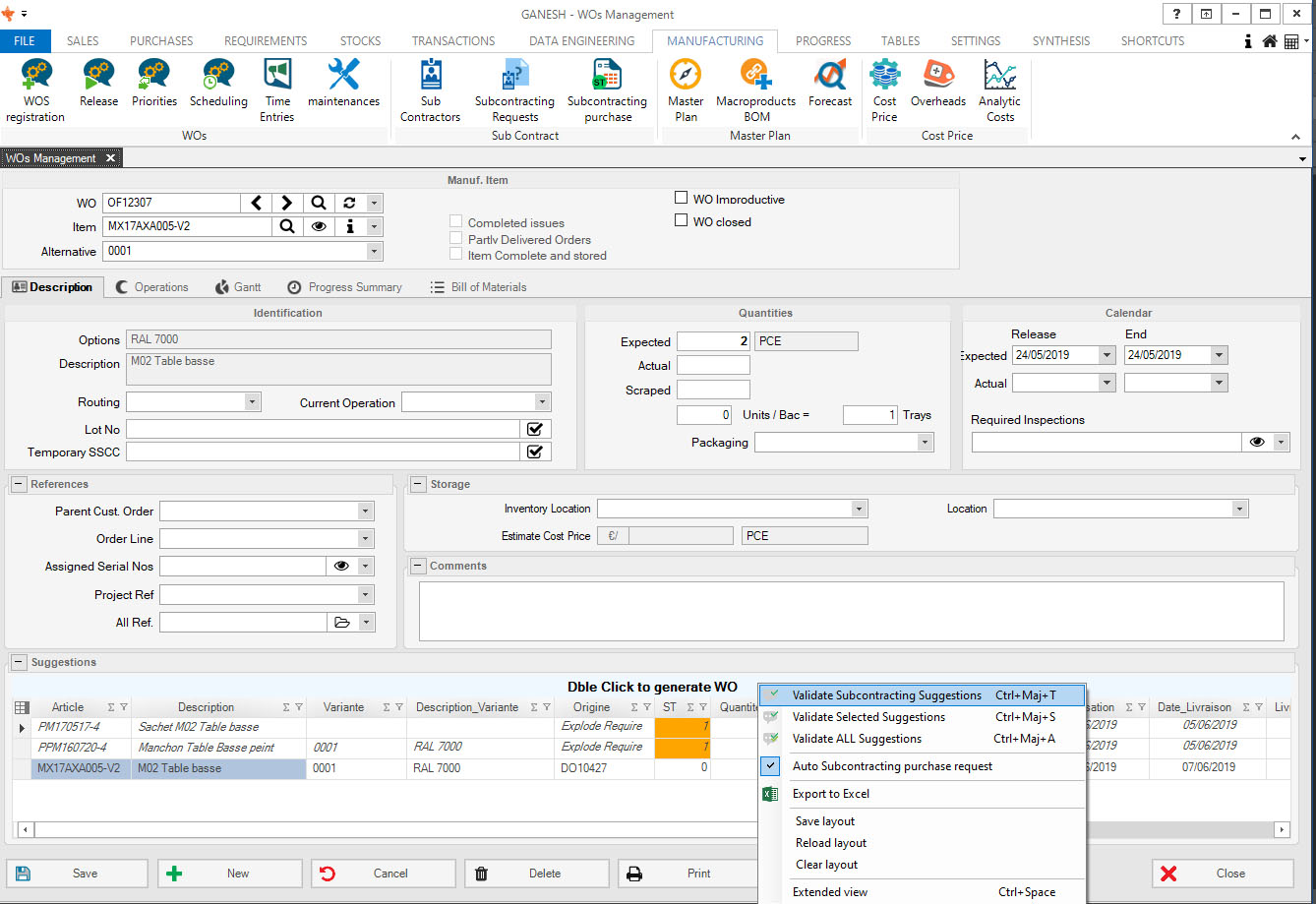 The Manufacturing module allows the Work orders (WO) management. It is possible to create Work Orders from manufacturing suggestions or directly, to manage subcontracting, to group subcontracting into supplier orders.