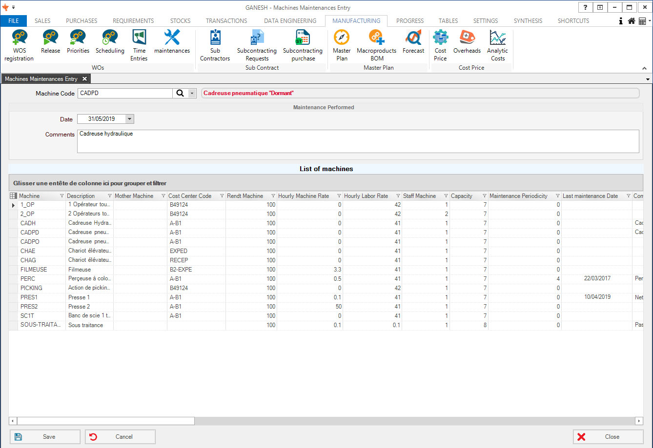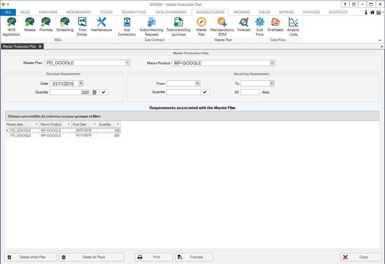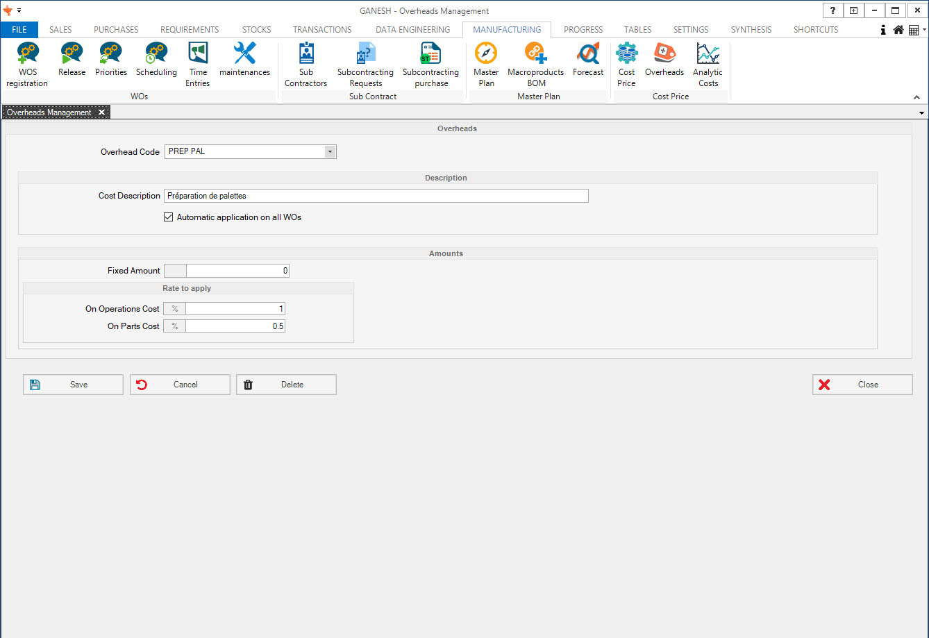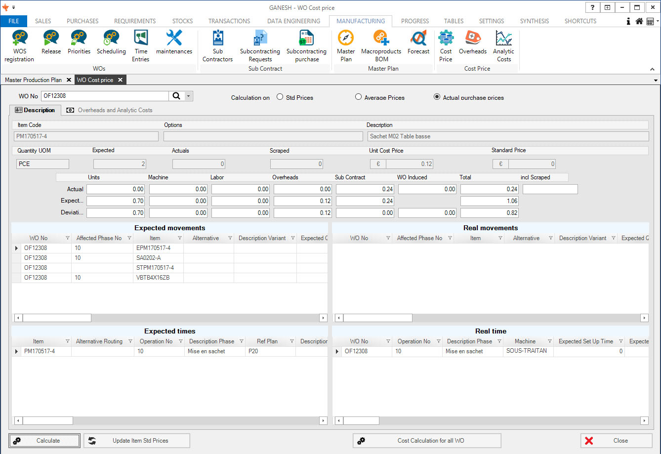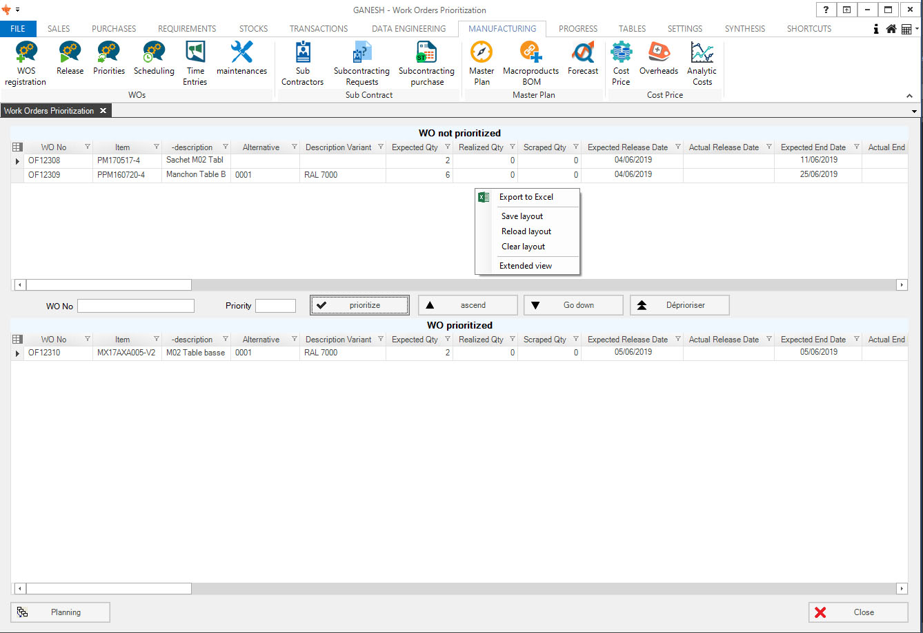The Manufacturing module allows the Work orders (WO) management. It is possible to create Work Orders from manufacturing suggestions or directly, to manage subcontracting, to group subcontracting into supplier orders.