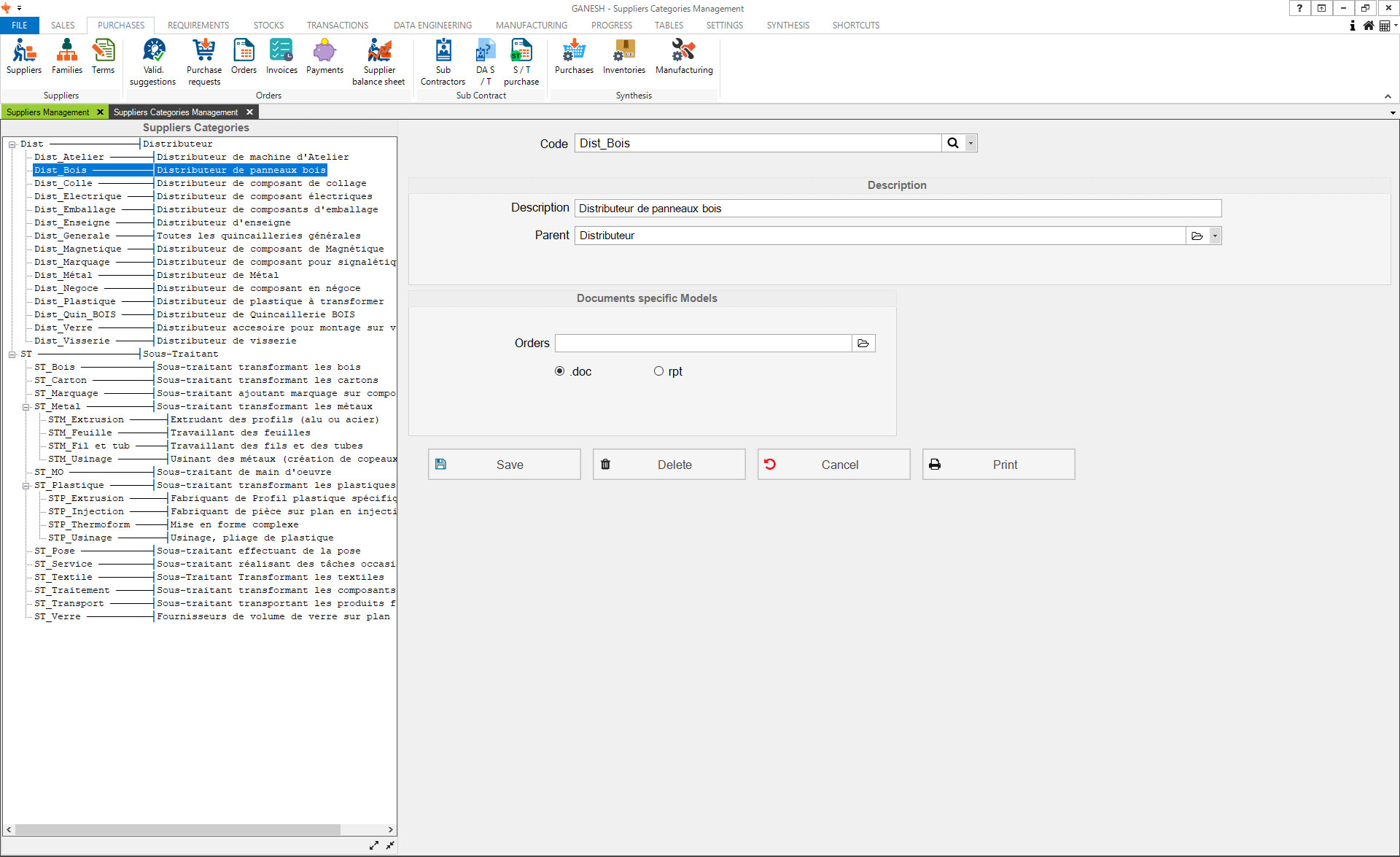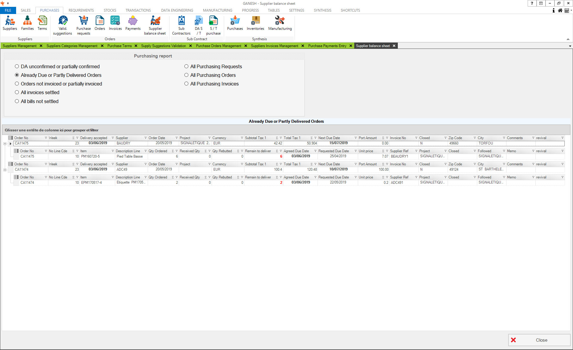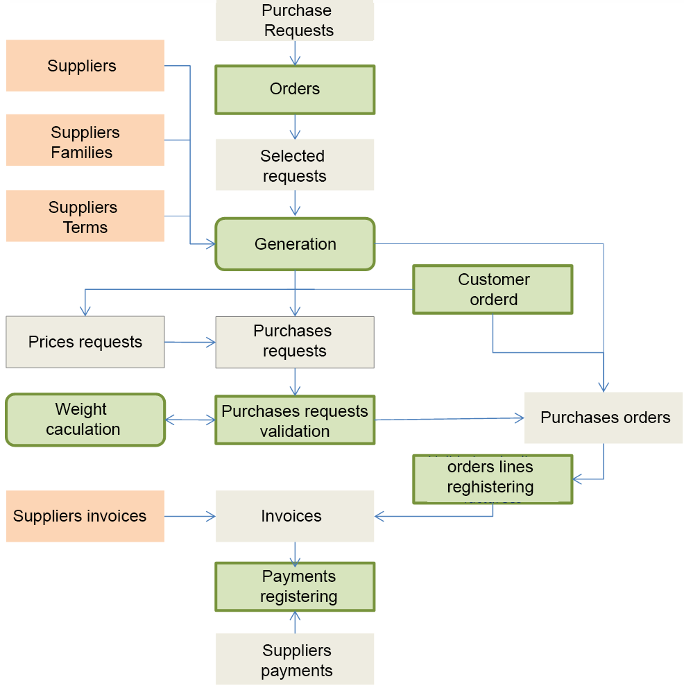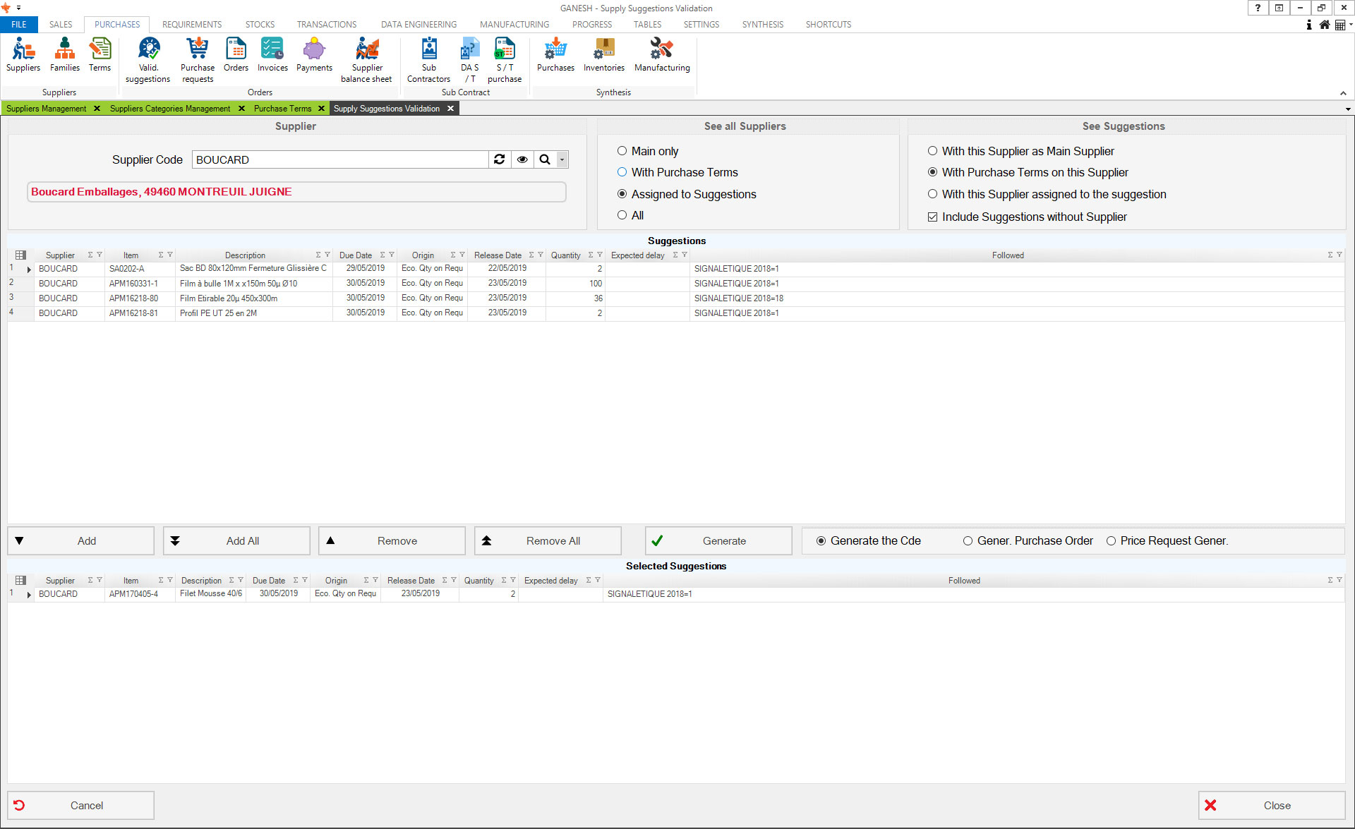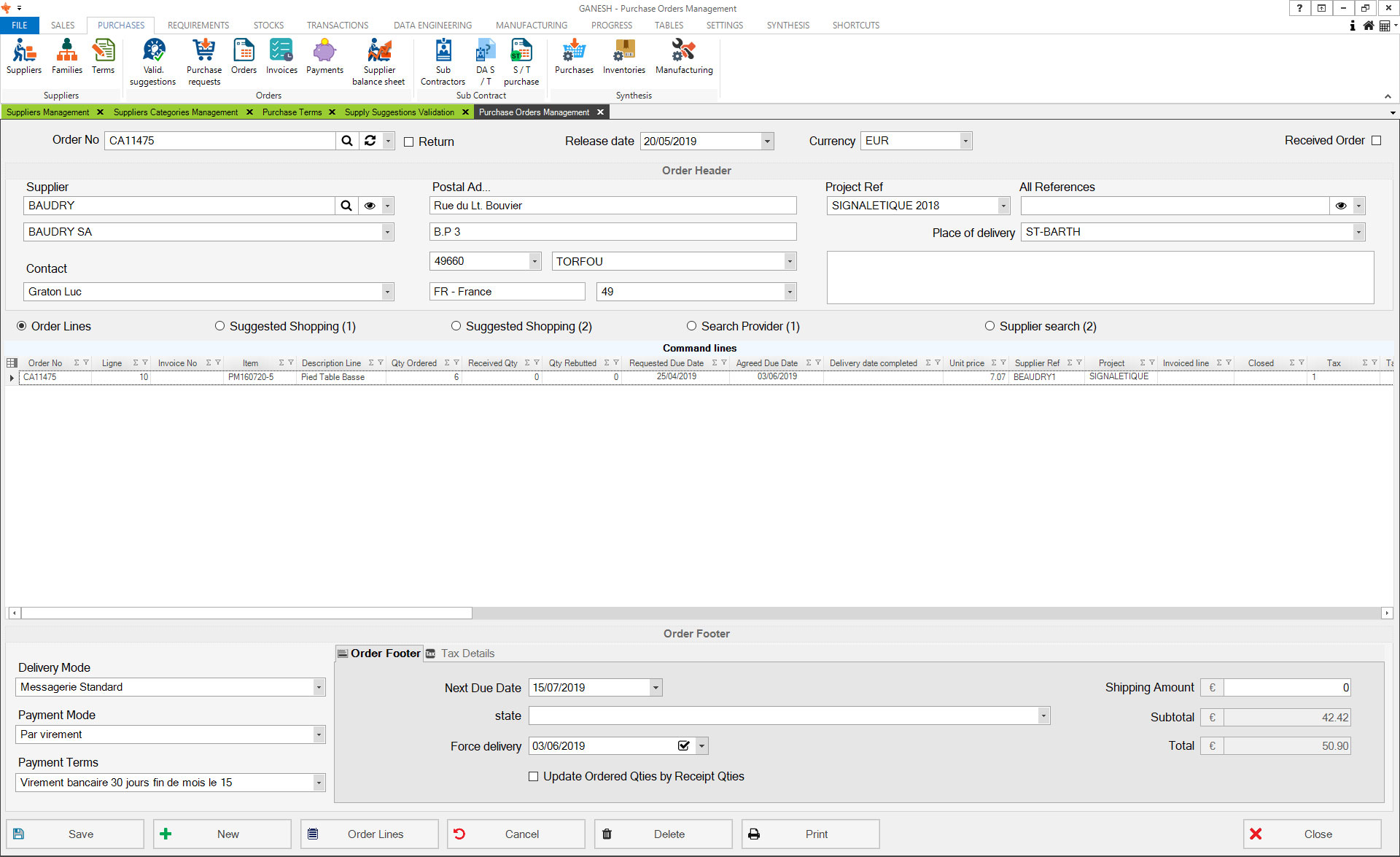 The purchasing management module includes all the functionalities allowing a complete management of the purchases of articles or subcontracting.