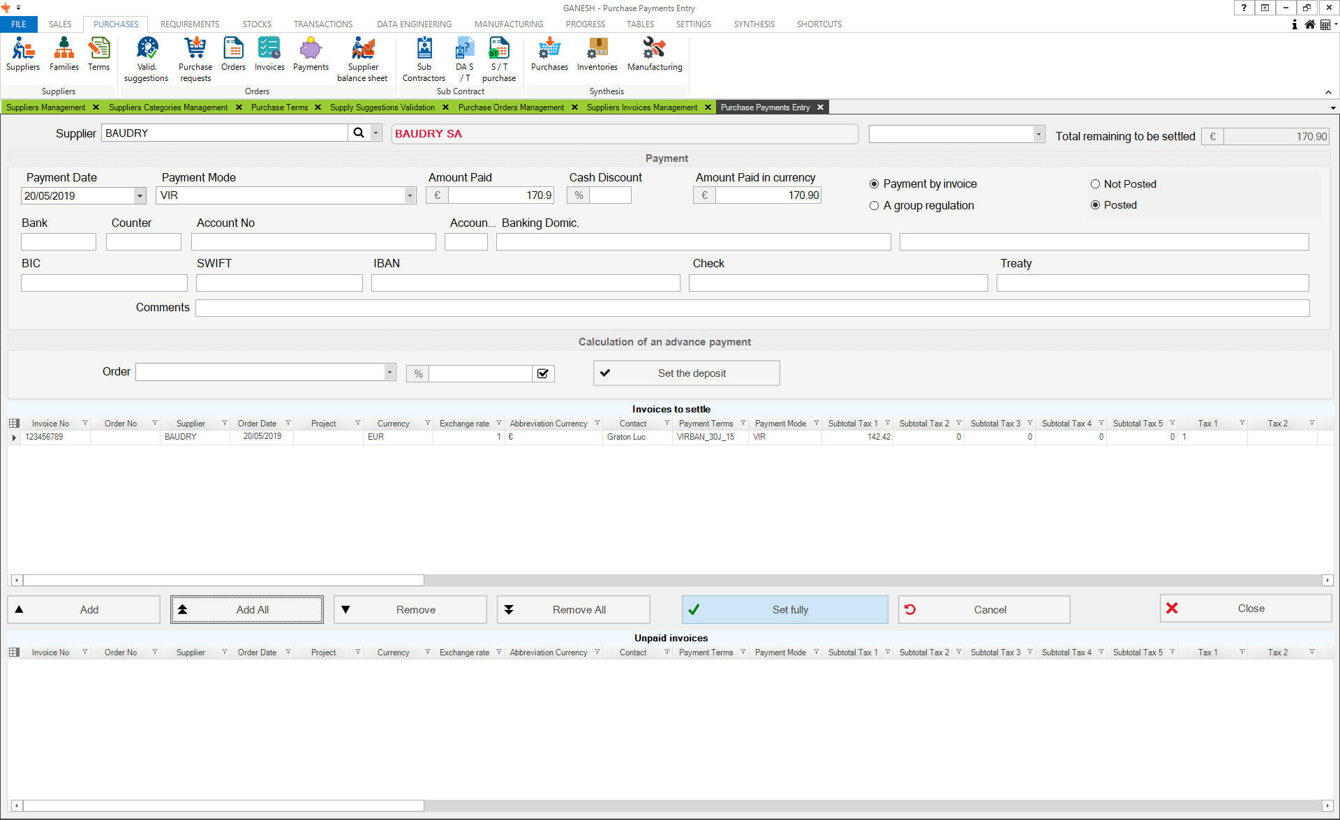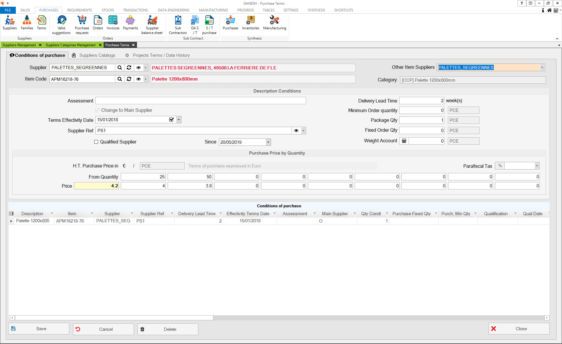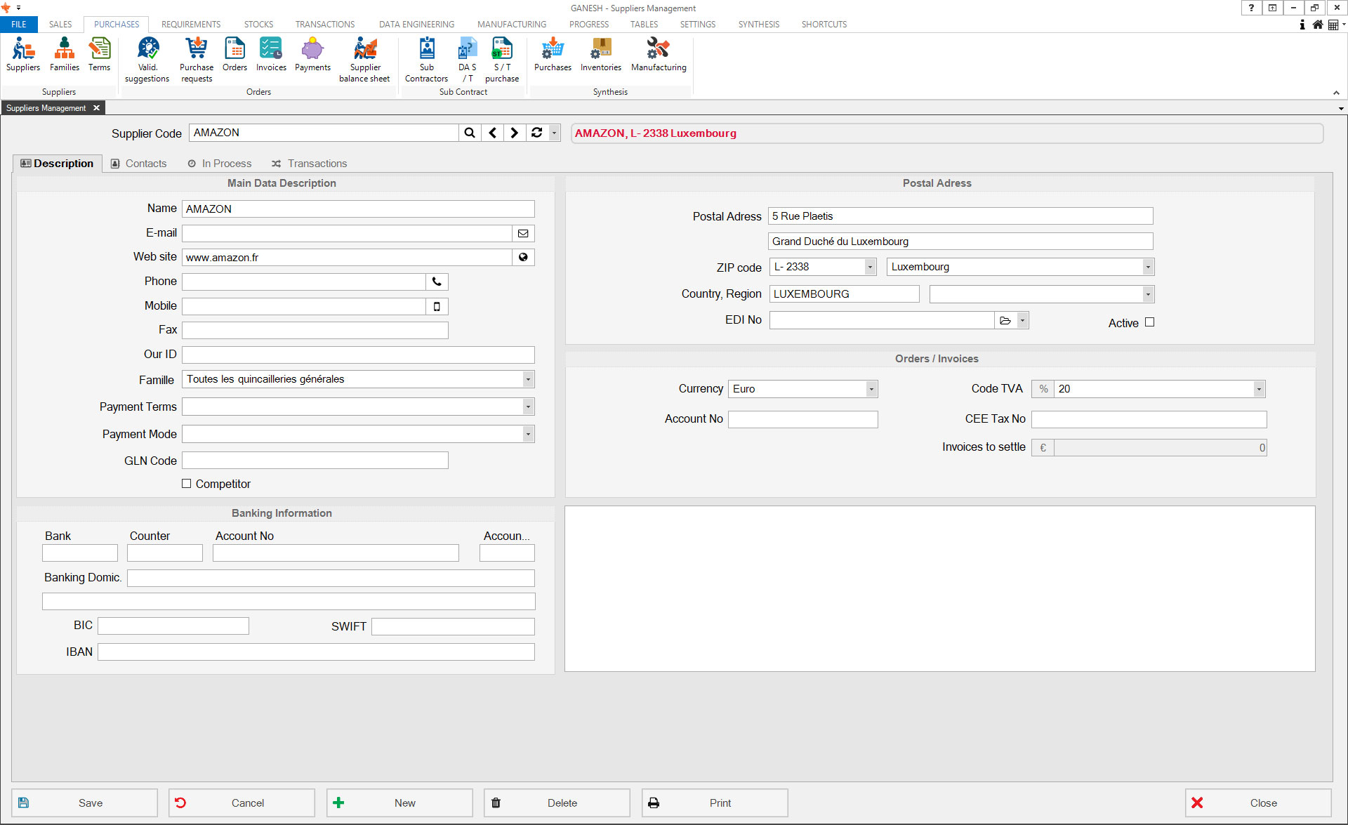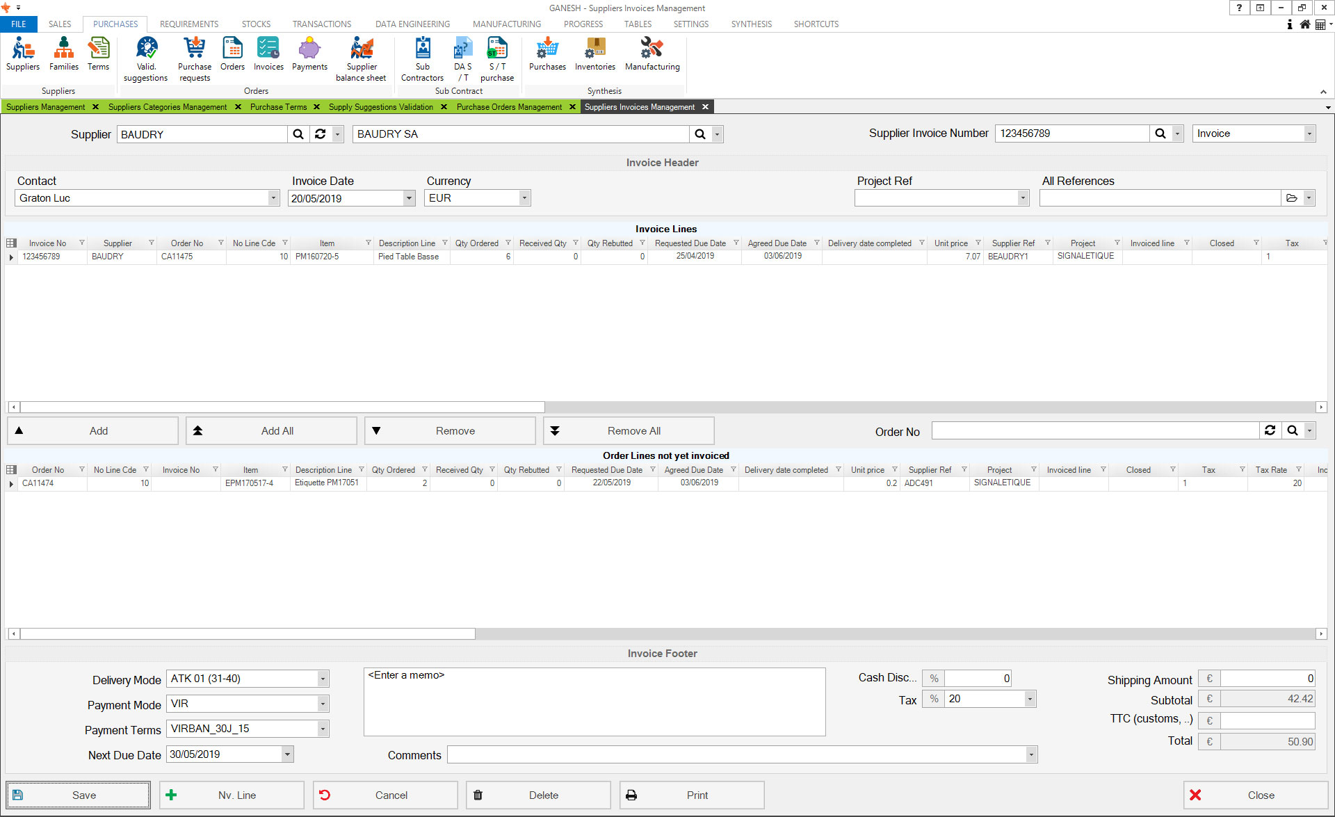 The purchasing management module includes all the functionalities allowing a complete management of the purchases of articles or subcontracting.