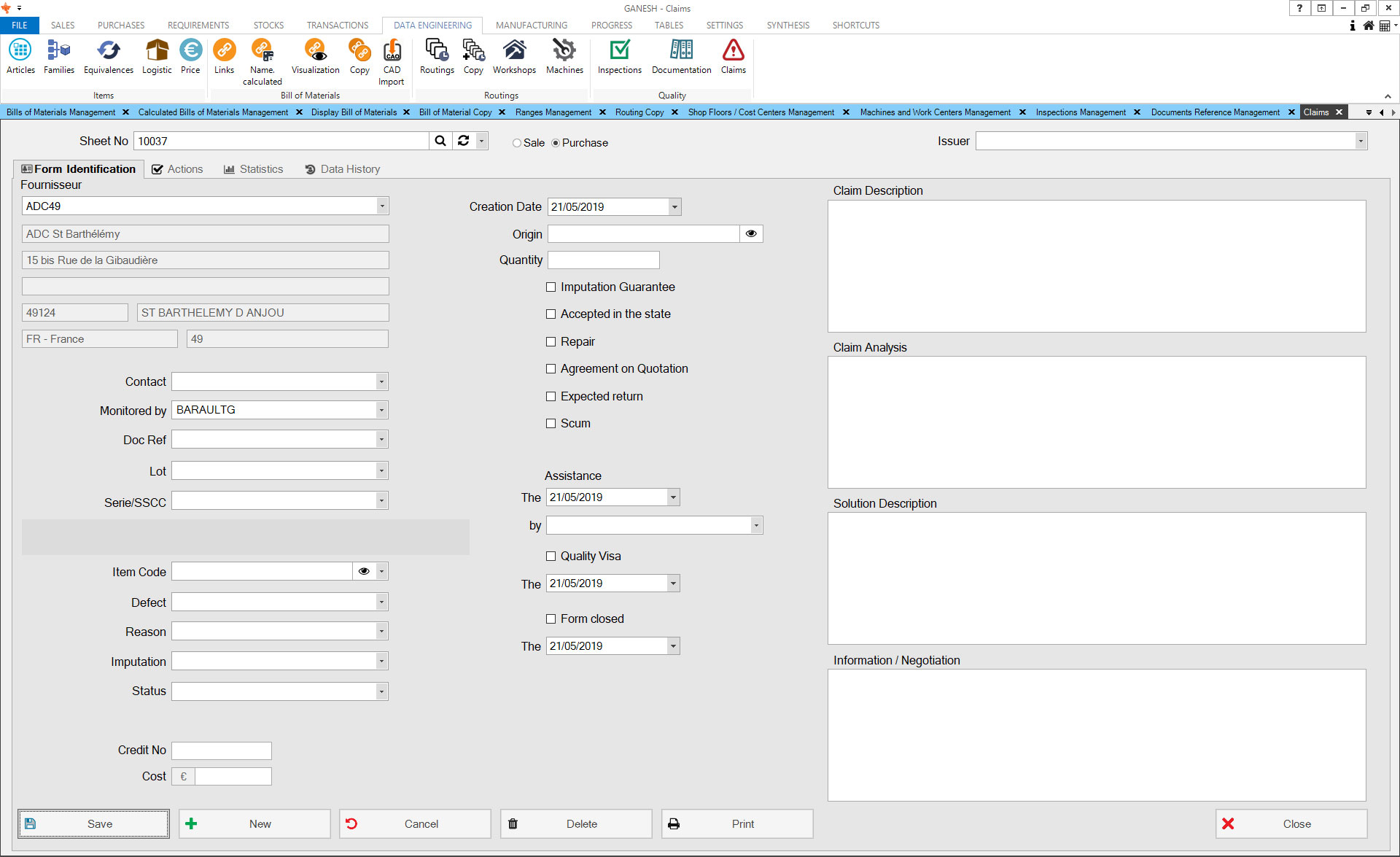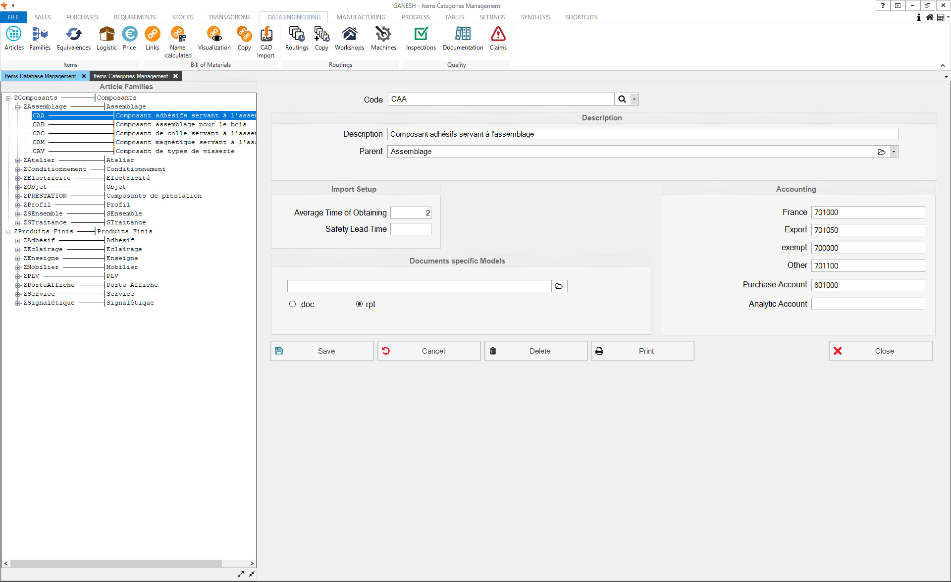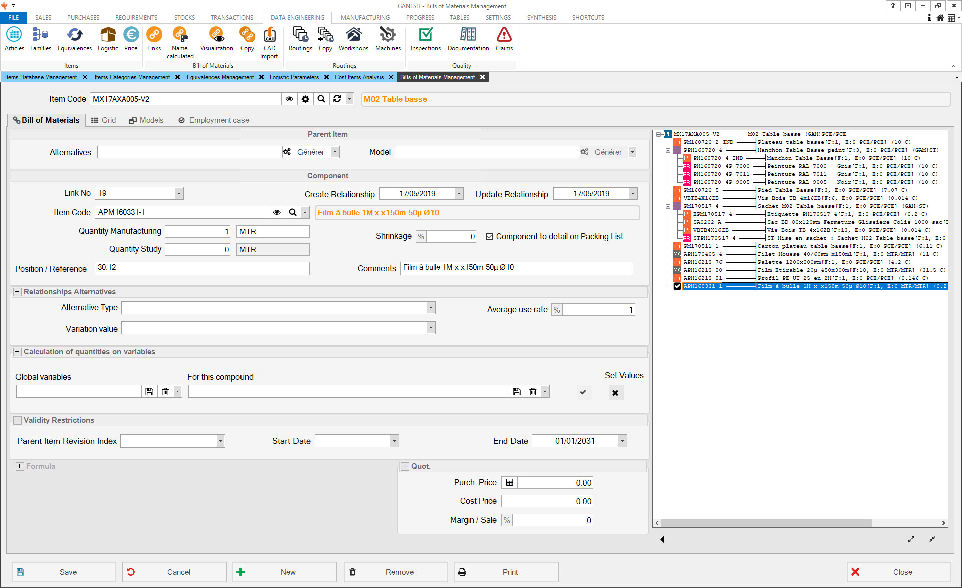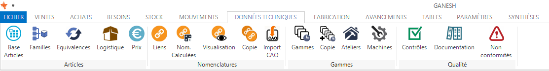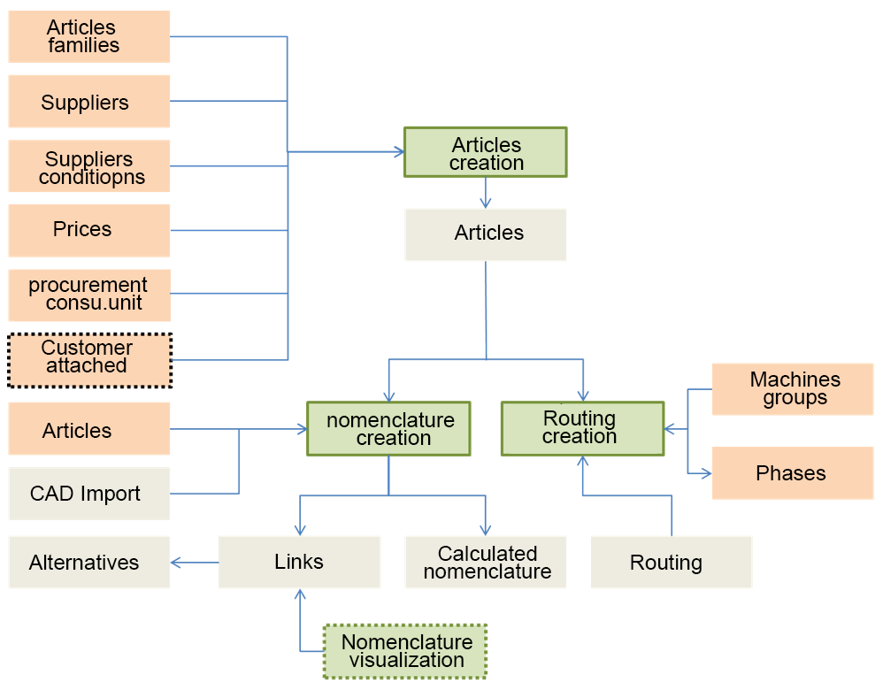 The Technical Data module allows the management of articles database. You can manually create articles or import finished product classifications from your CAD solution. Ranges and prices by vendors and quantities can also be imported.