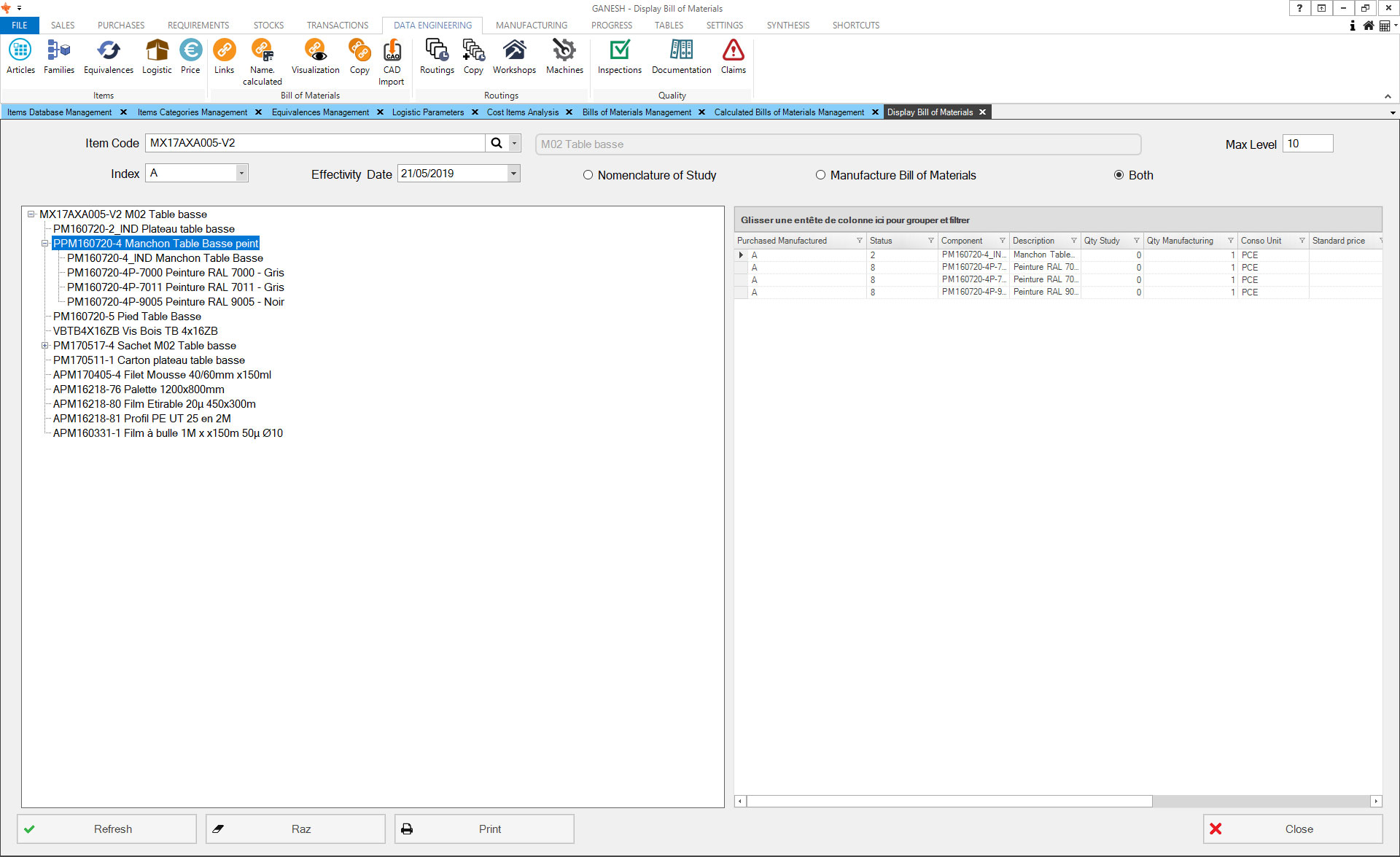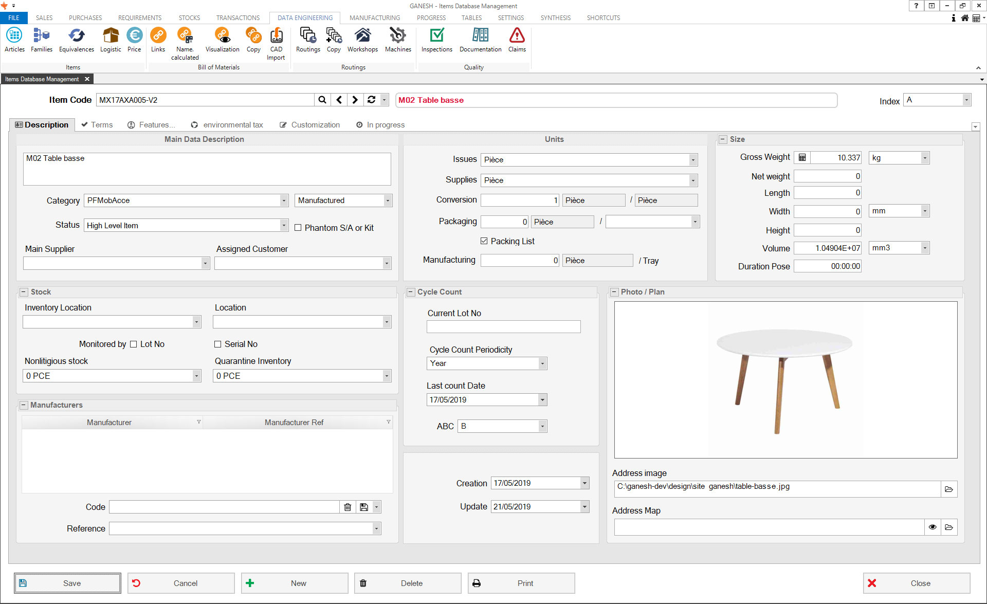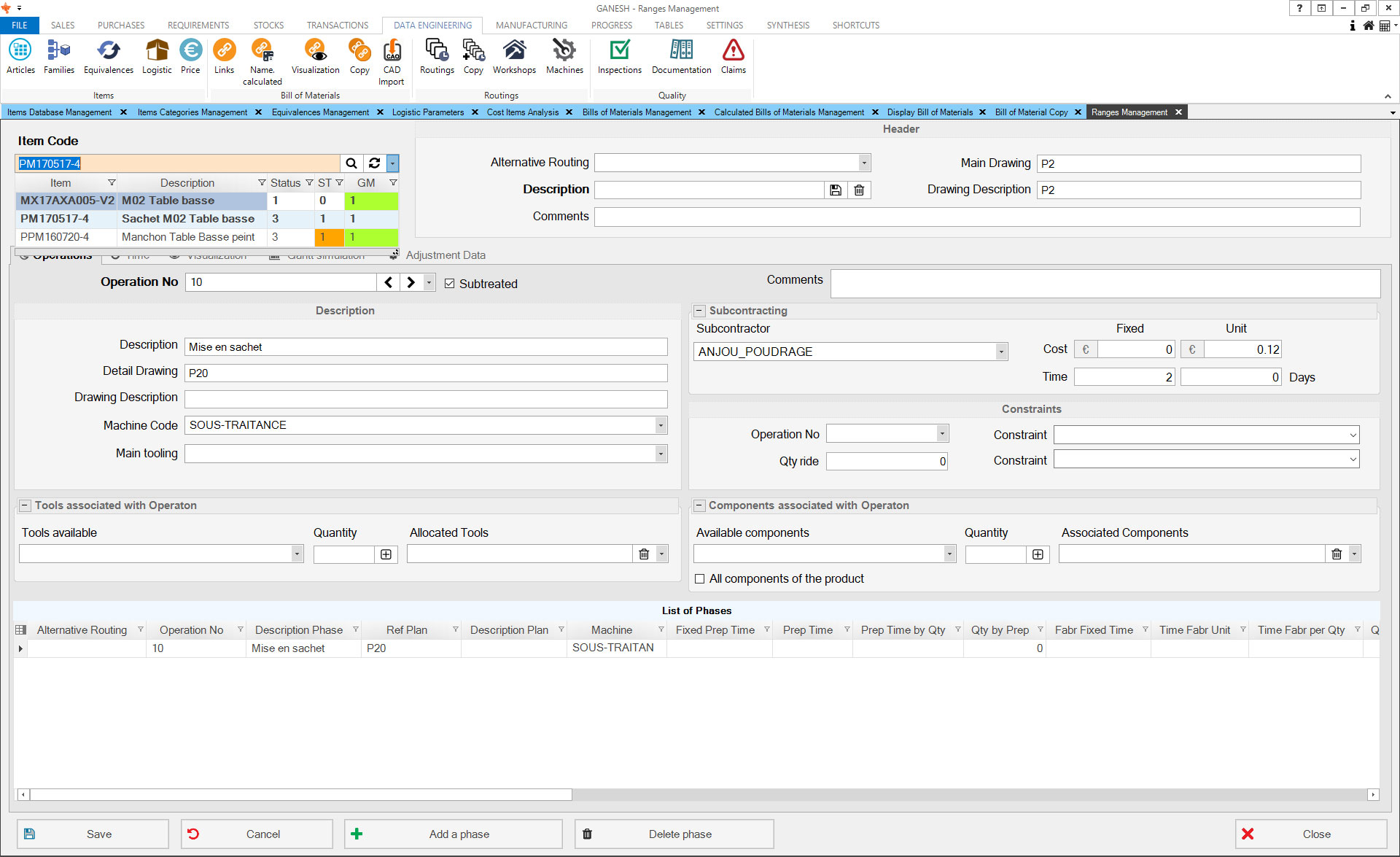 The Technical Data module allows the management of articles database. You can manually create articles or import finished product classifications from your CAD solution. Ranges and prices by vendors and quantities can also be imported.