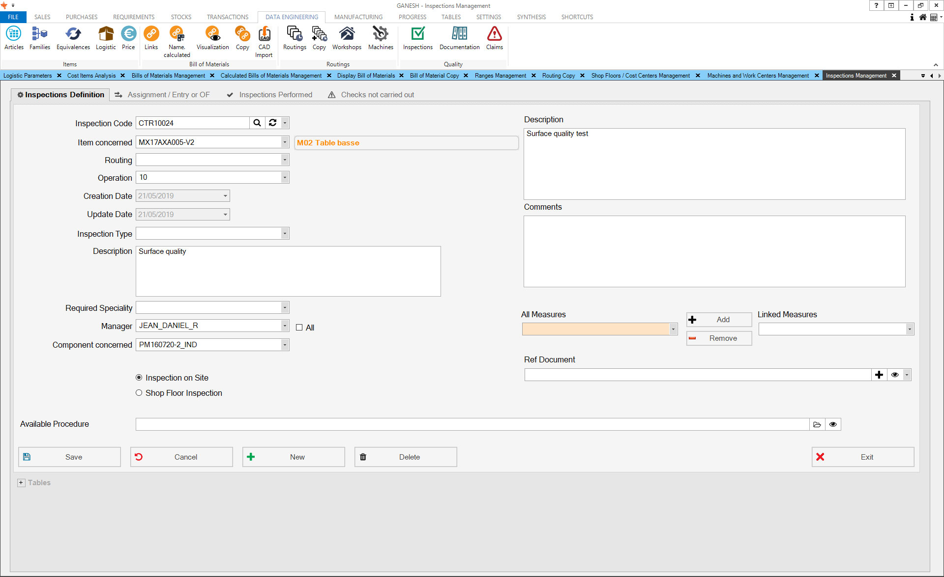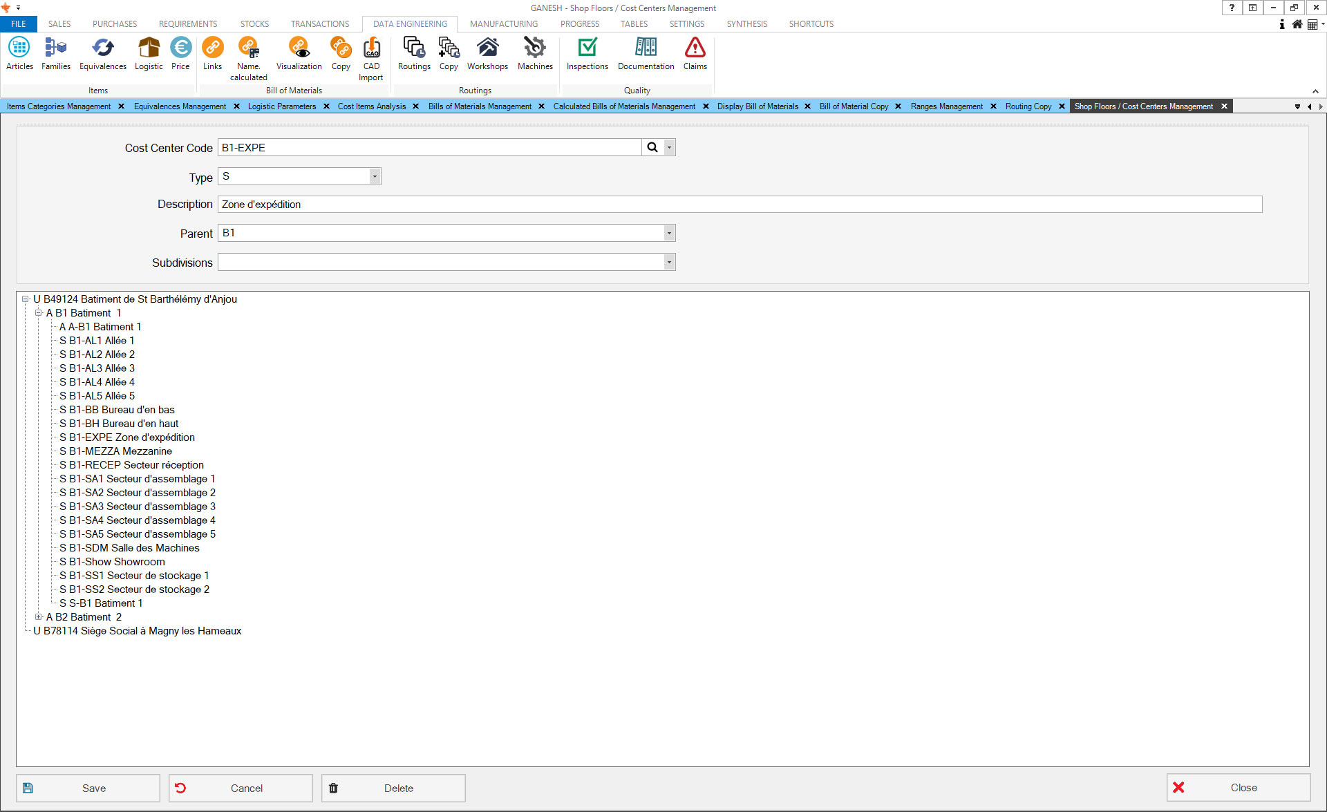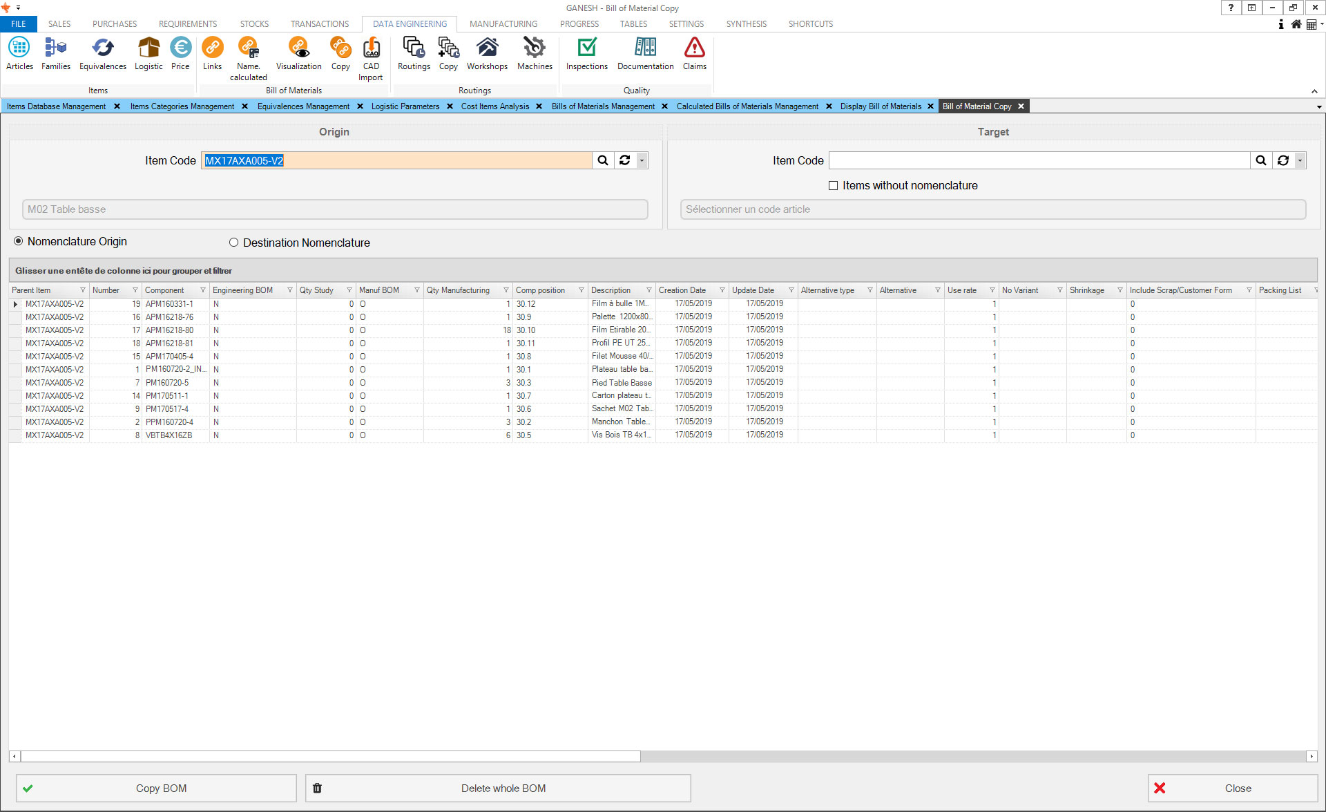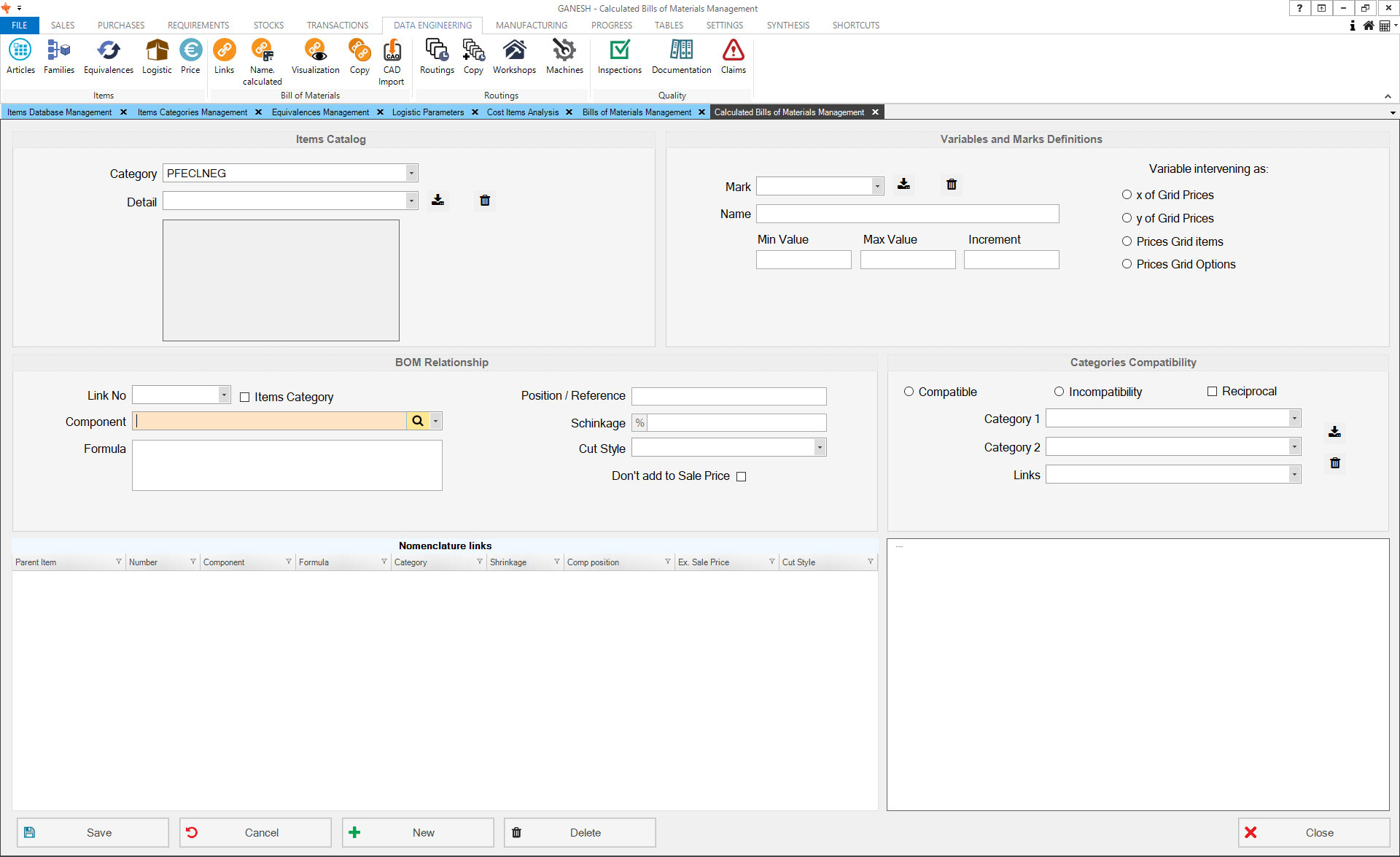 - Management of dynamic nomenclatures of finished and semi-finished products