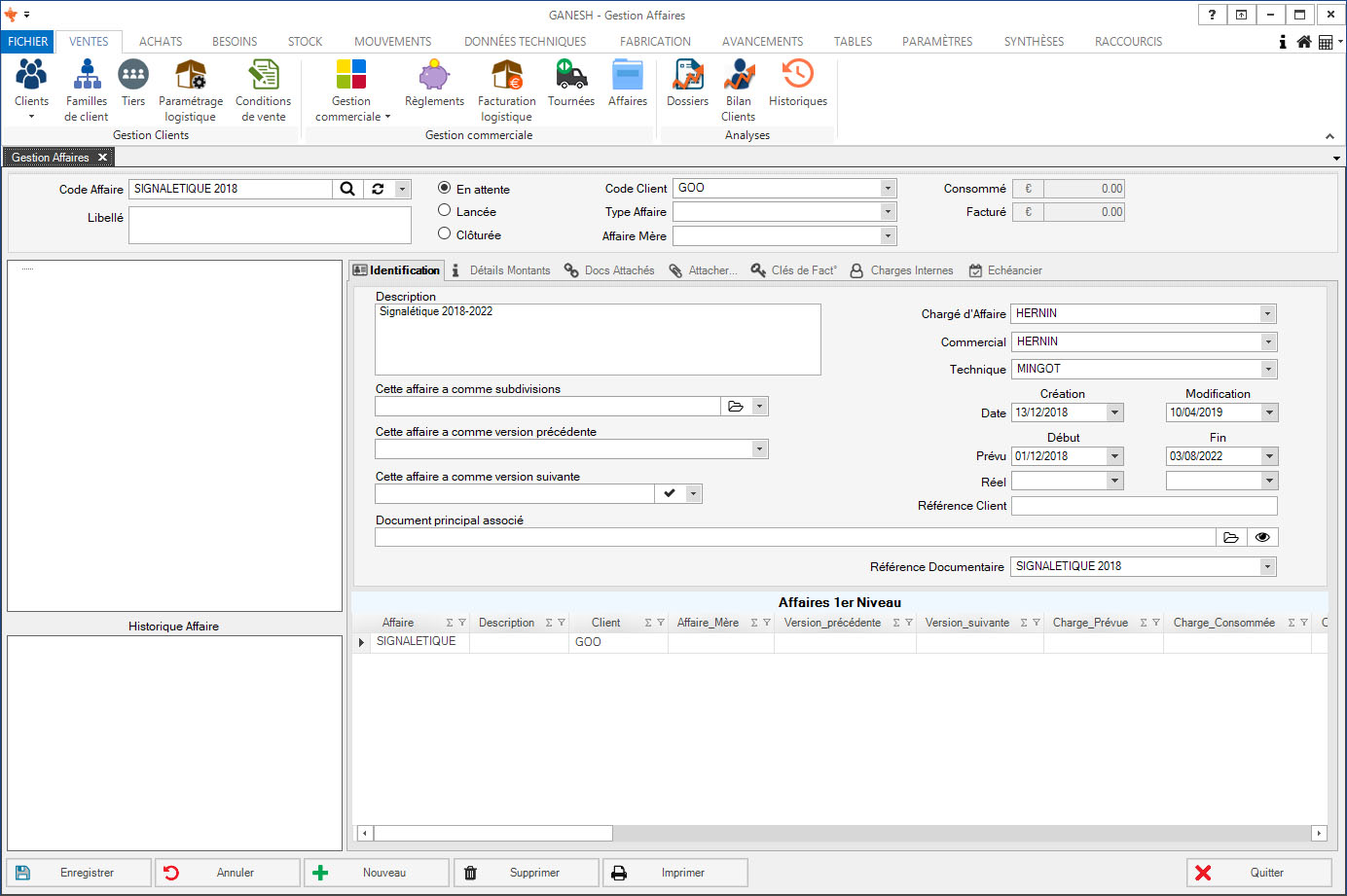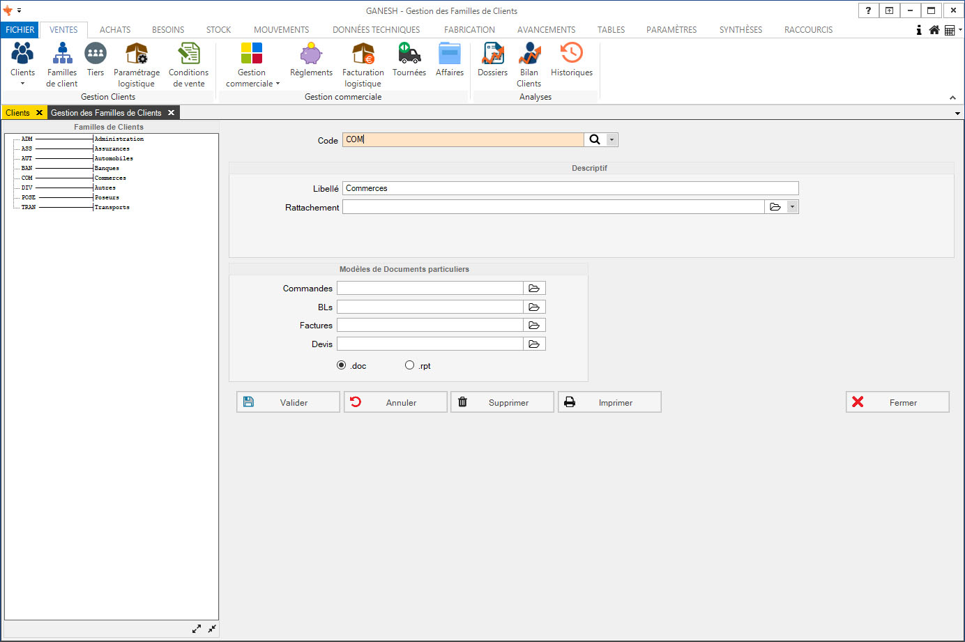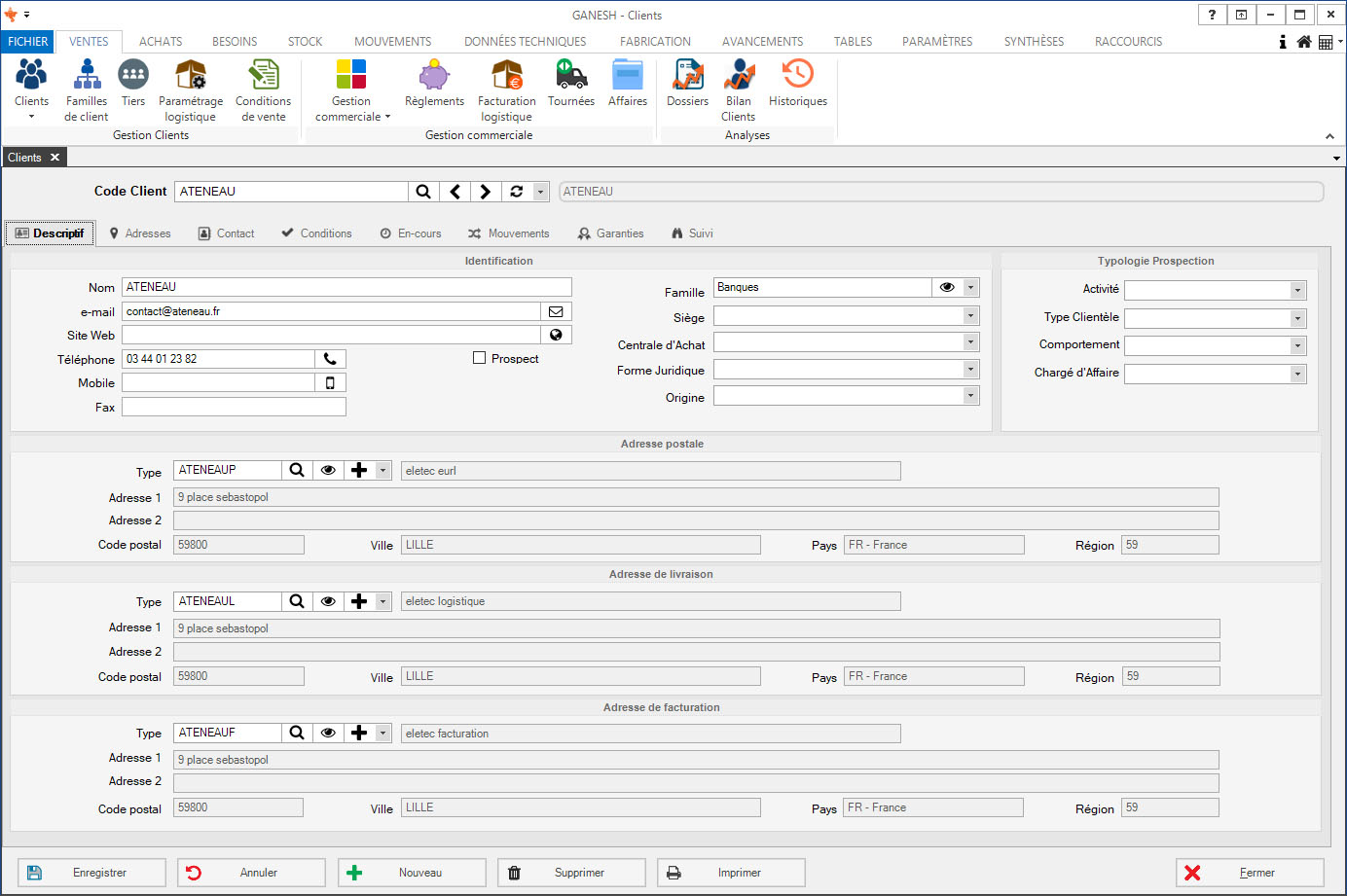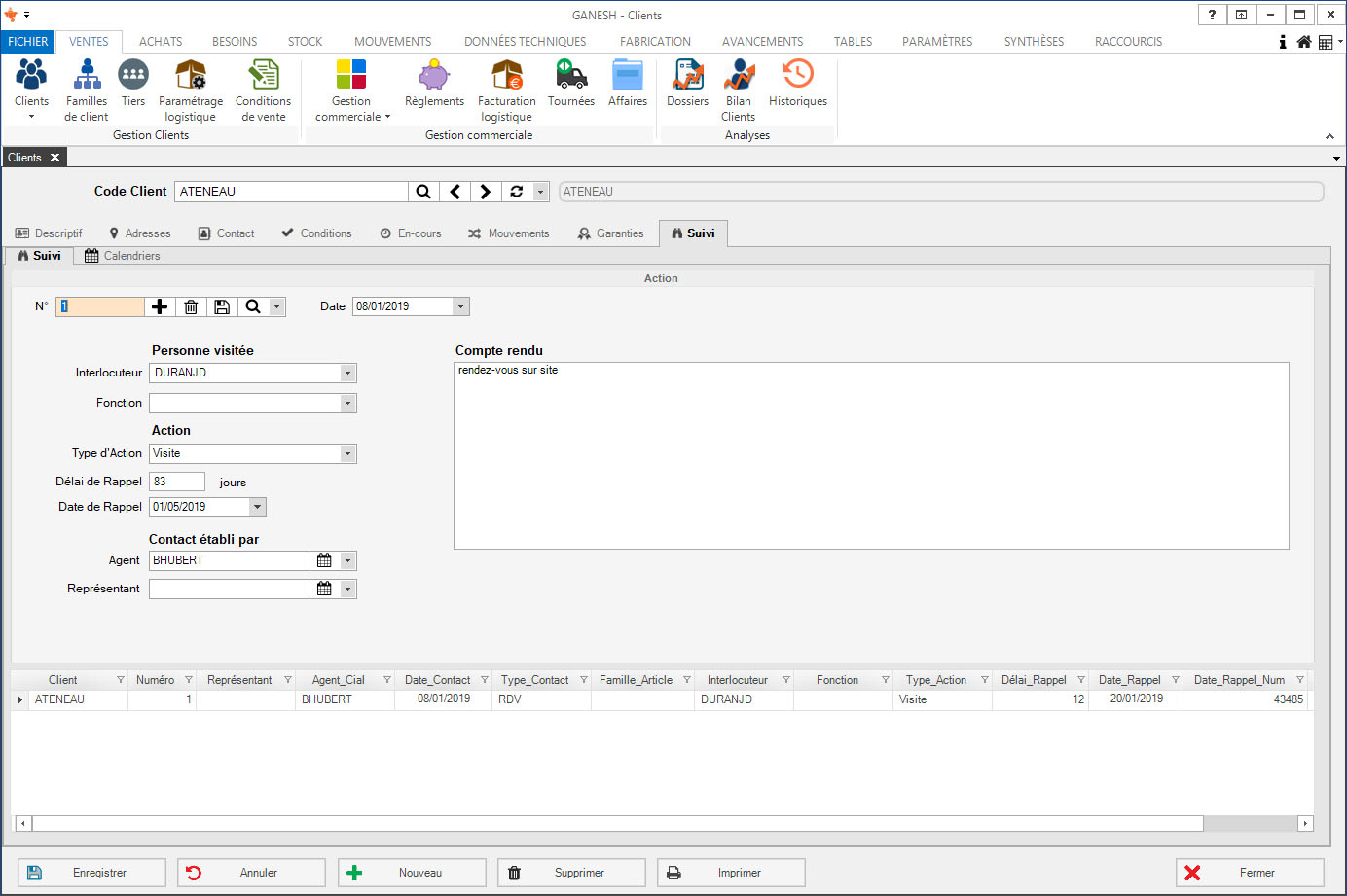 L’onglet « Ventes » du logiciel Ganesh regroupe toutes les fonctions relatives aux ventes et à vos clients. Dans ce menu intuitif divisé en trois parties se trouvent les options concernant la gestion de vos clients, des affaires et leurs suivis