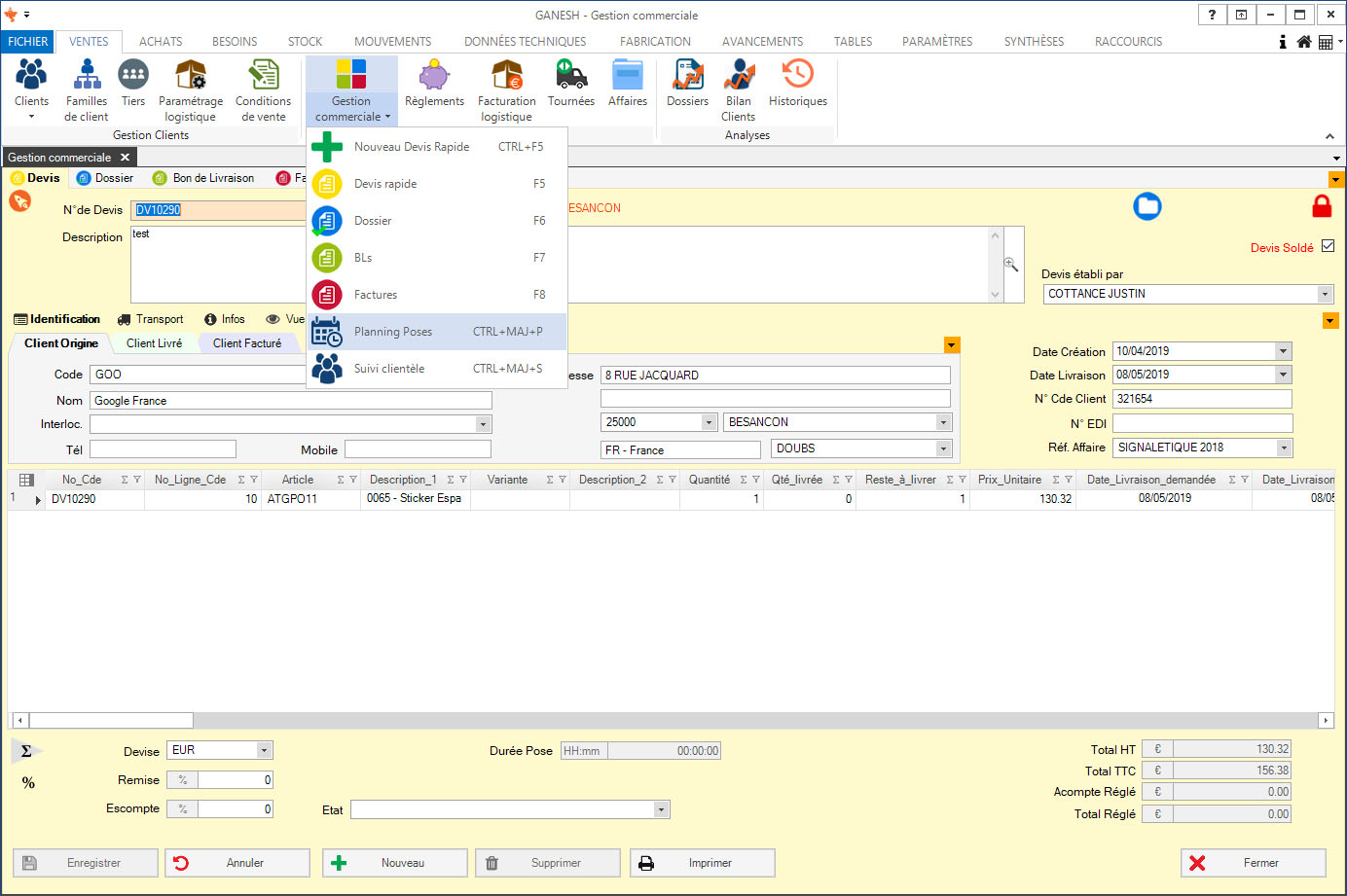- Gestion commerciale : Devis, dossiers, bons de livraison, factures, planning de pose