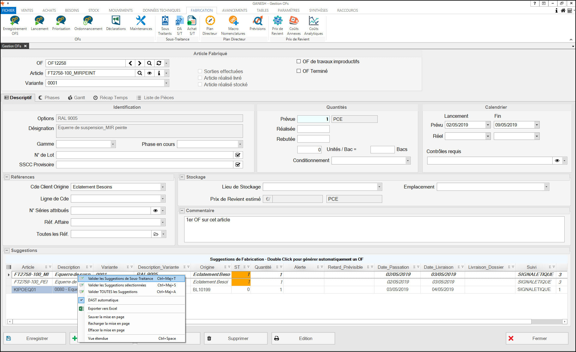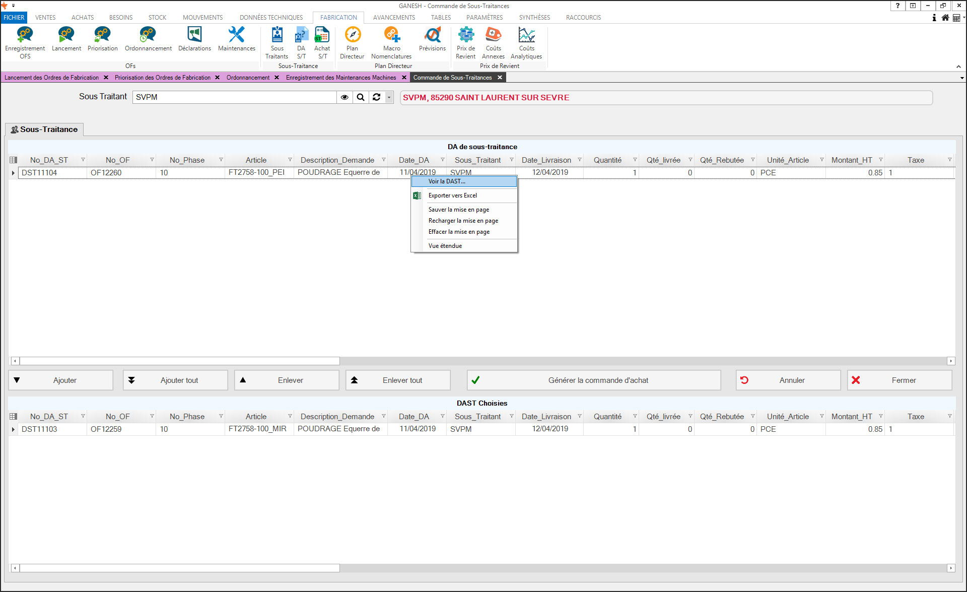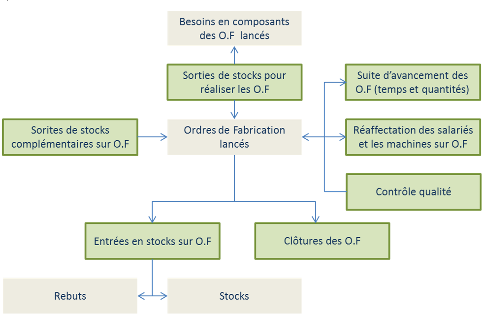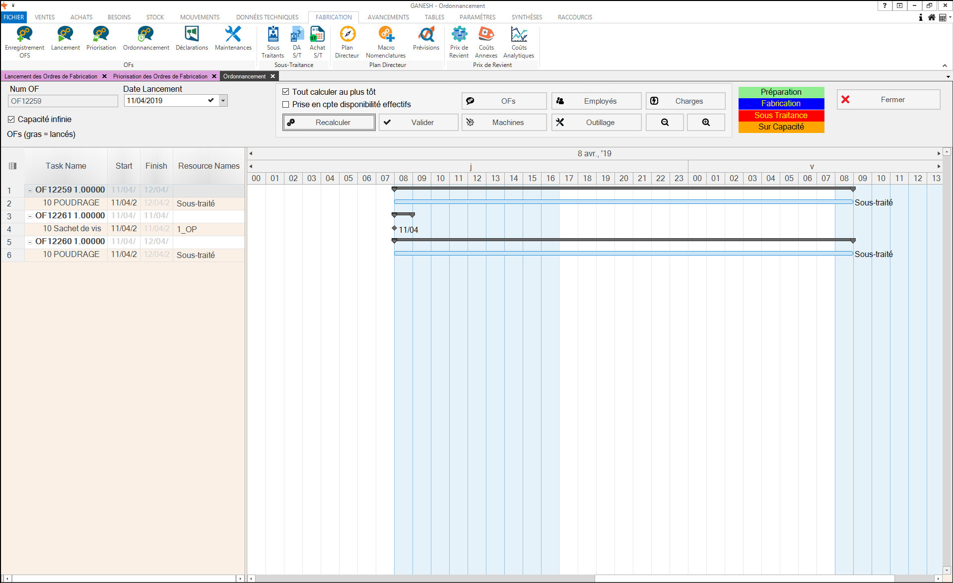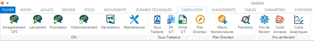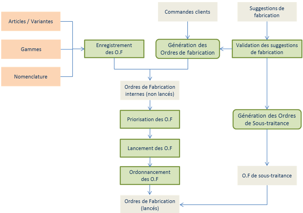 Le module Fabrications permet la gestion des Ordres de fabrication (OF). Il est possible de créer des Ordres de fabrication depuis les suggestions de fabrication ou directement, de gérer la sous traitance (DAST), de regrouper des sous traitance dans des commandes fournisseurs.