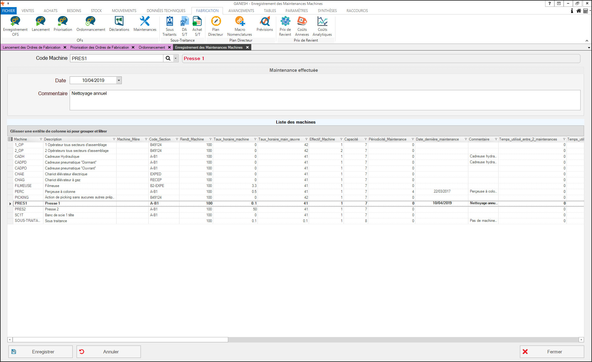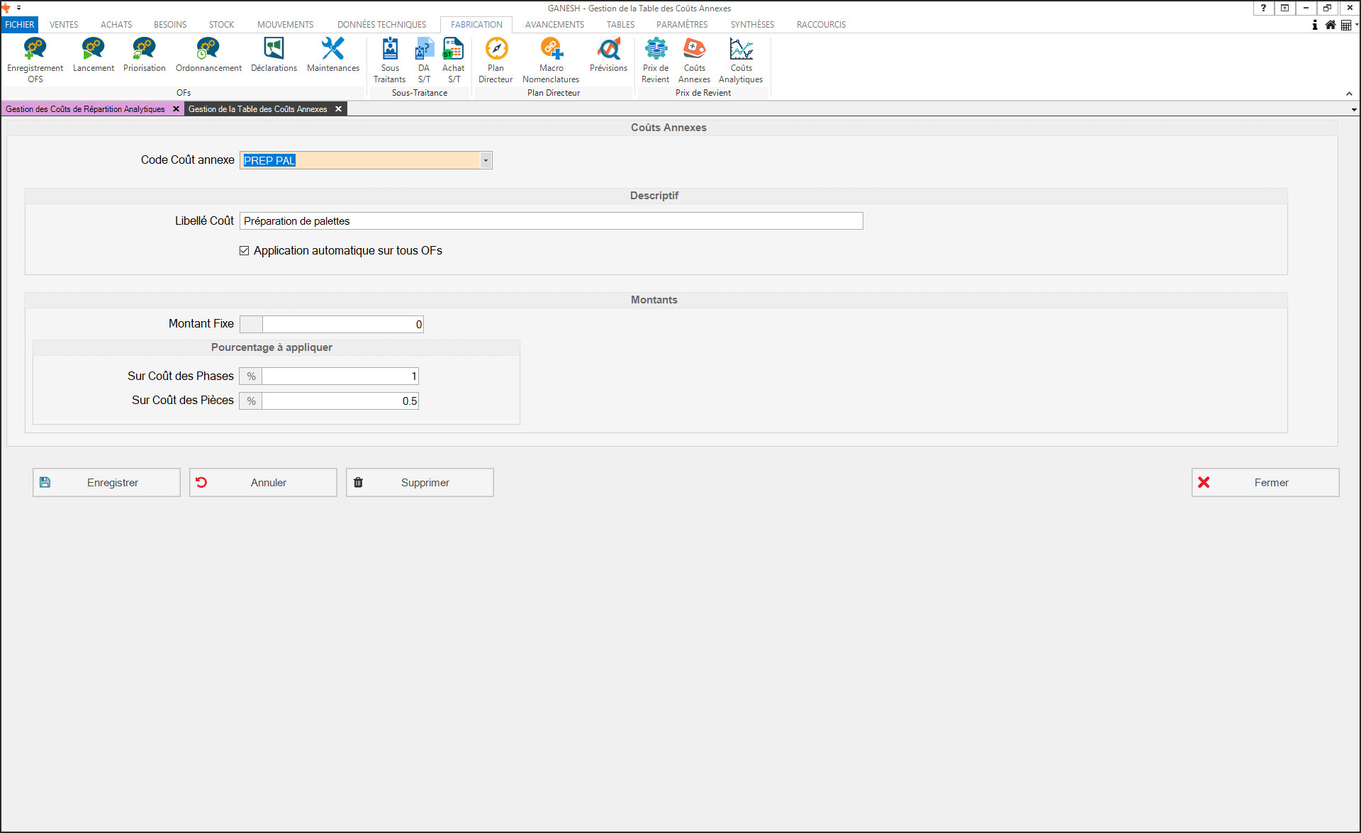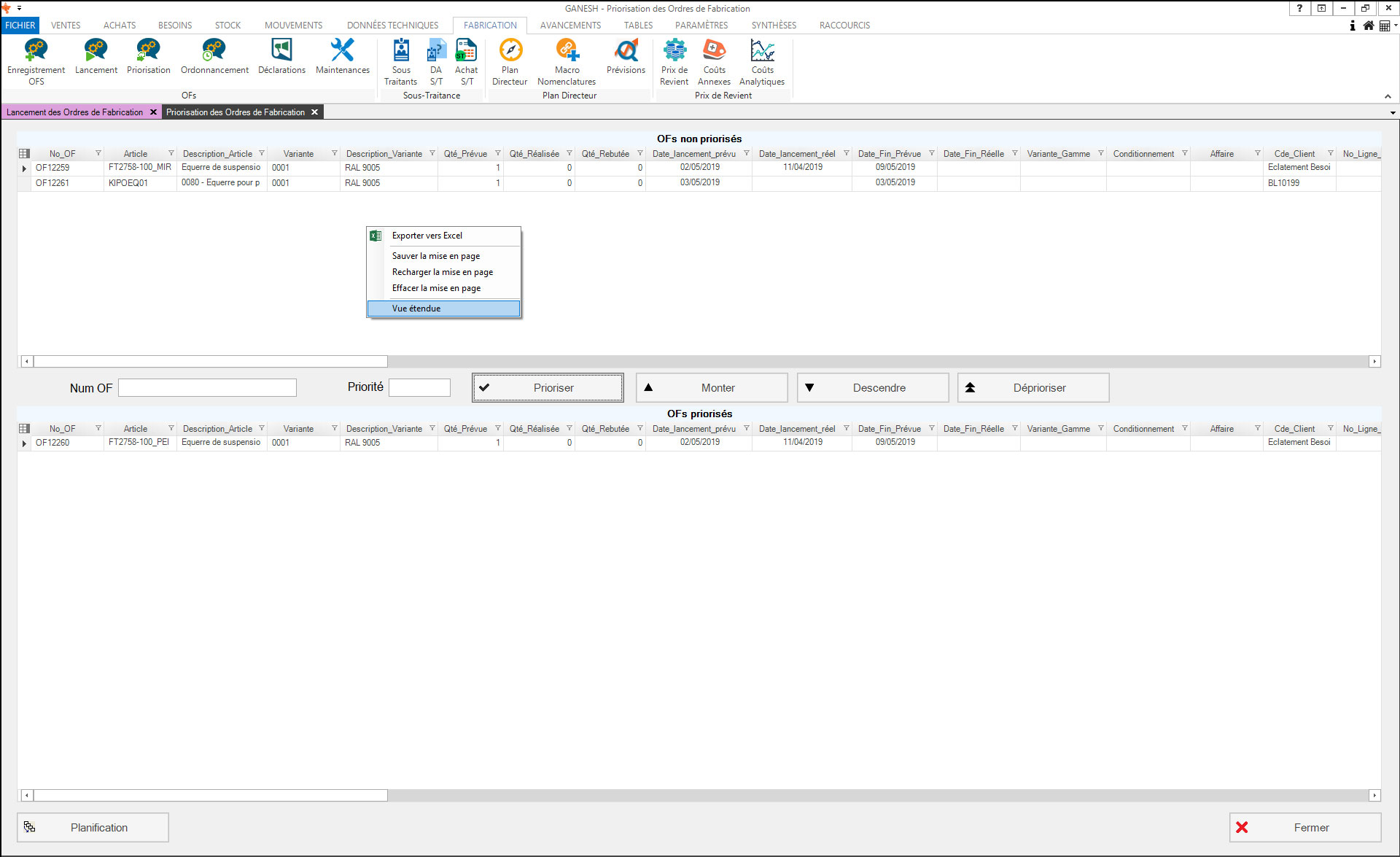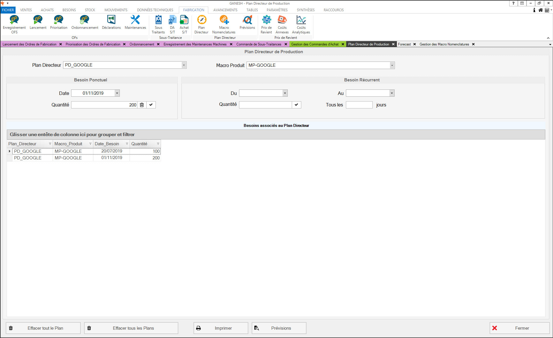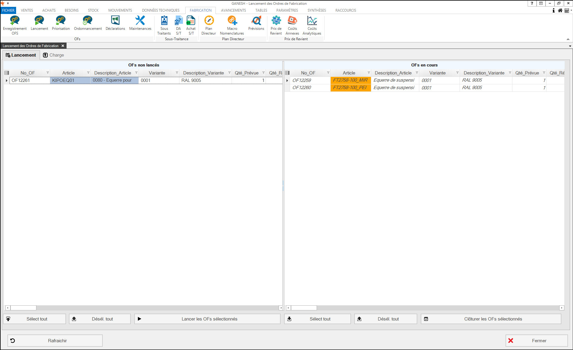 Le module Fabrications permet la gestion des Ordres de fabrication (OF). Il est possible de créer des Ordres de fabrication depuis les suggestions de fabrication ou directement, de gérer la sous traitance (DAST), de regrouper des sous traitance dans des commandes fournisseurs.